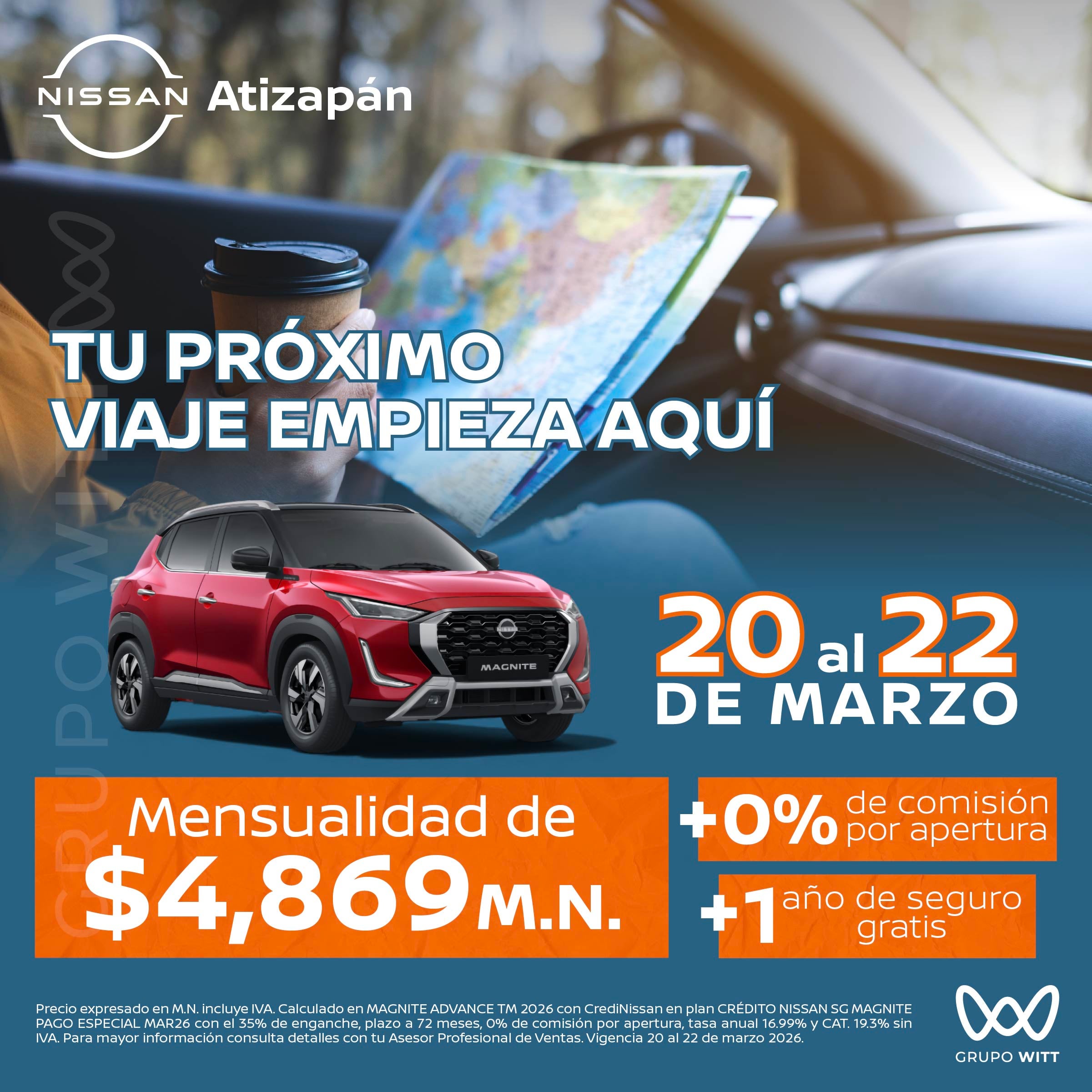 Precio expresado en M.N. incluye IVA. Calculado en MAGNITE ADVANCE TM 2026 con CrediNissan en plan CRÉDITO NISSAN SG MAGNITE PAGO ESPECIAL MAR26 con el 35% de enganche, plazo a 72 meses, 0% de comisión por apertura, tasa anual 16.99% y CAT. 19.3% sin IVA. Para mayor información consulta detalles con tu Asesor Profesional de Ventas. Vigencia 20 al 22 de marzo 2026.