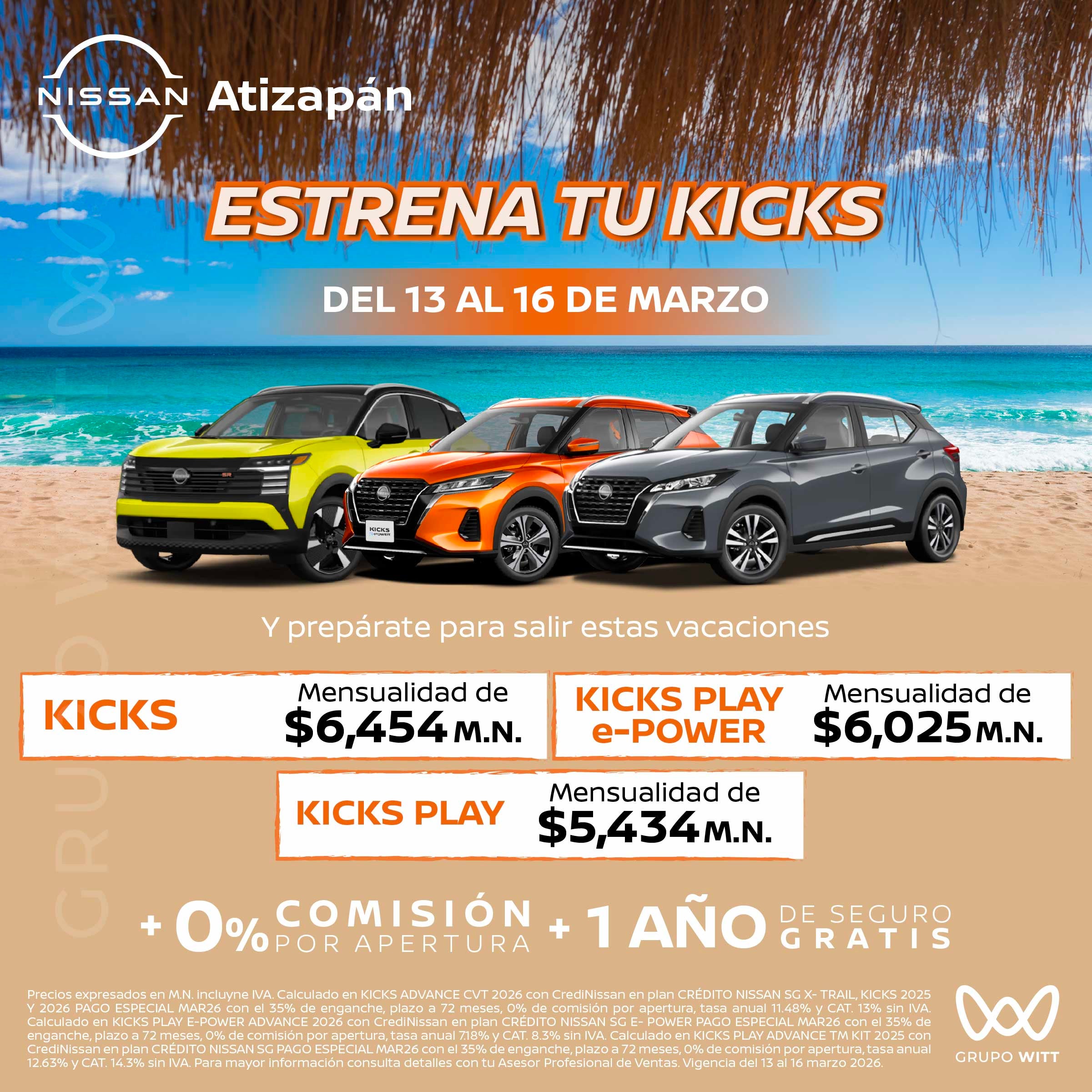 Precios expresados en M.N. incluye IVA. Calculado en KICKS ADVANCE CVT 2026 con CrediNissan en plan CRÉDITO NISSAN SG X- TRAIL, KICKS 2025 Y 2026 PAGO ESPECIAL MAR26 con el 35% de enganche, plazo a 72 meses, 0% de comisión por apertura, tasa anual 11.48% y CAT. 13% sin IVA. Calculado en KICKS PLAY E-POWER ADVANCE 2026 con CrediNissan en plan CRÉDITO NISSAN SG E- POWER PAGO ESPECIAL MAR26 con el 35% de enganche, plazo a 72 meses, 0% de comisión por apertura, tasa anual 718% y CAT. 8.3% sin IVA. Calculado en KICKS PLAY ADVANCE TM KIT 2025 con CrediNissan en plan CRÉDITO NISSAN SG PAGO ESPECIAL MAR26 con el 35% de enganche, plazo a 72 meses, 0% de comisión por apertura, tasa anual 12.63% y CAT. 14.3% sin IVA. Para mayor información consulta detalles con tu Asesor Profesional de Ventas. Vigencia del 13 al 16 marzo 2026.