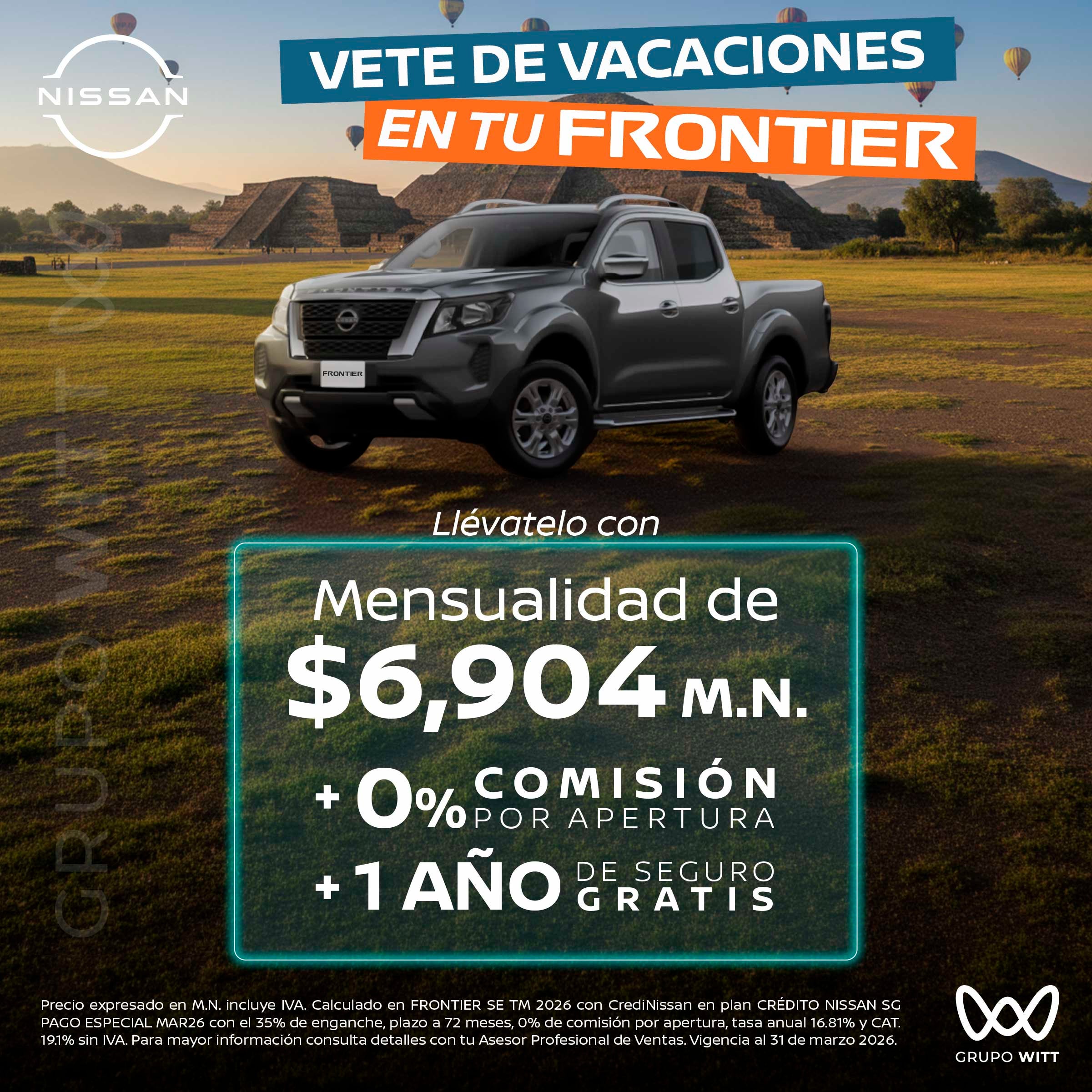 Precio expresado en M.N. incluye IVA. Calculado en FRONTIER SE TM 2026 con CrediNissan en plan CRÉDITO NISSAN SG PAGO ESPECIAL MAR26 con el 35% de enganche, plazo a 72 meses, 0% de comisión por apertura, tasa anual 16.81% y CAT. 19.1% sin IVA. Para mayor información consulta detalles con tu Asesor Profesional de Ventas. Vigencia al 31 de marzo 2026.