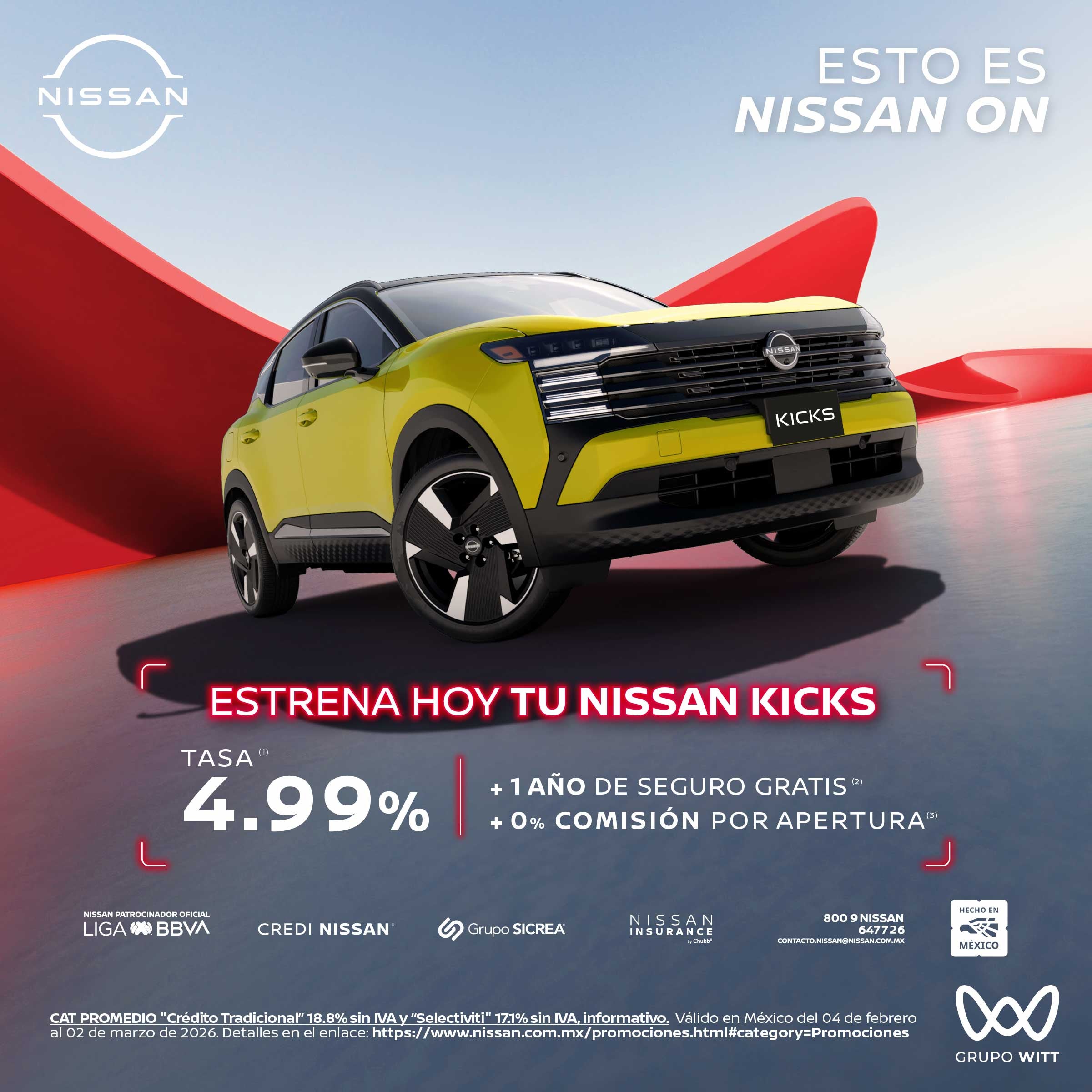 CAT PROMEDIO "Crédito Tradicional" 18.8% sin IVA y "Selectiviti" 17.1% sin IVA, informativo. Válido en México del 04 de febrero al 02 de marzo de 2026. Detalles en el enlace: https://www.nissan.com.mx/promociones.html#category=Promociones