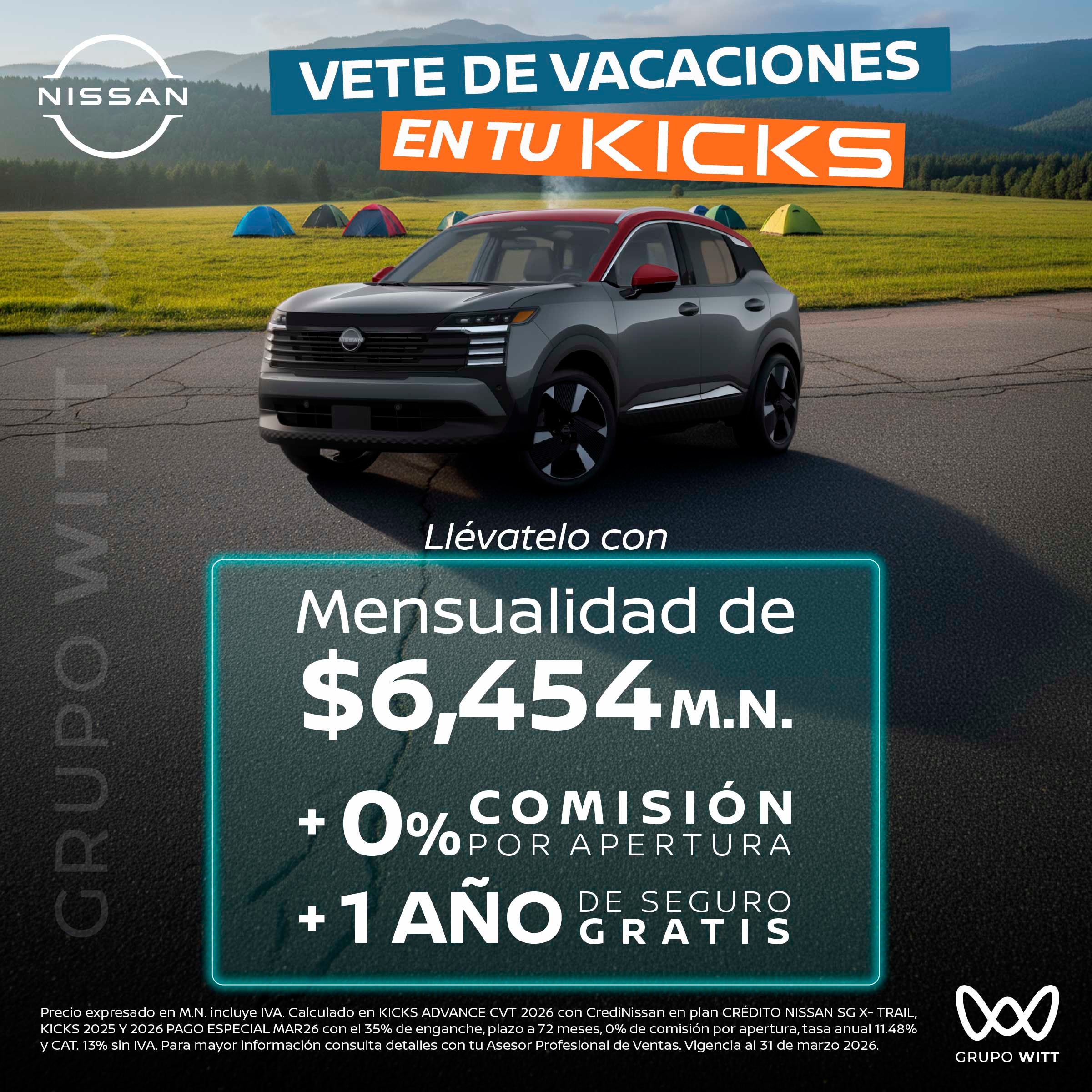 Precio expresado en M.N. incluye IVA. Calculado en KICKS ADVANCE CVT 2026 con CrediNissan en plan CREDITO NISSAN SG X- TRAIL, KICKS 2025 Y 2026 PAGO ESPECIAL MAR26 con el 35% de enganche, plazo a 72 meses, 0% de comisión por apertura, tasa anual 11.48% y CAT. 13% sin IVA. Para mayor información consulta detalles con tu Asesor Profesional de Ventas. Vigencia al 31 de marzo 2026.
