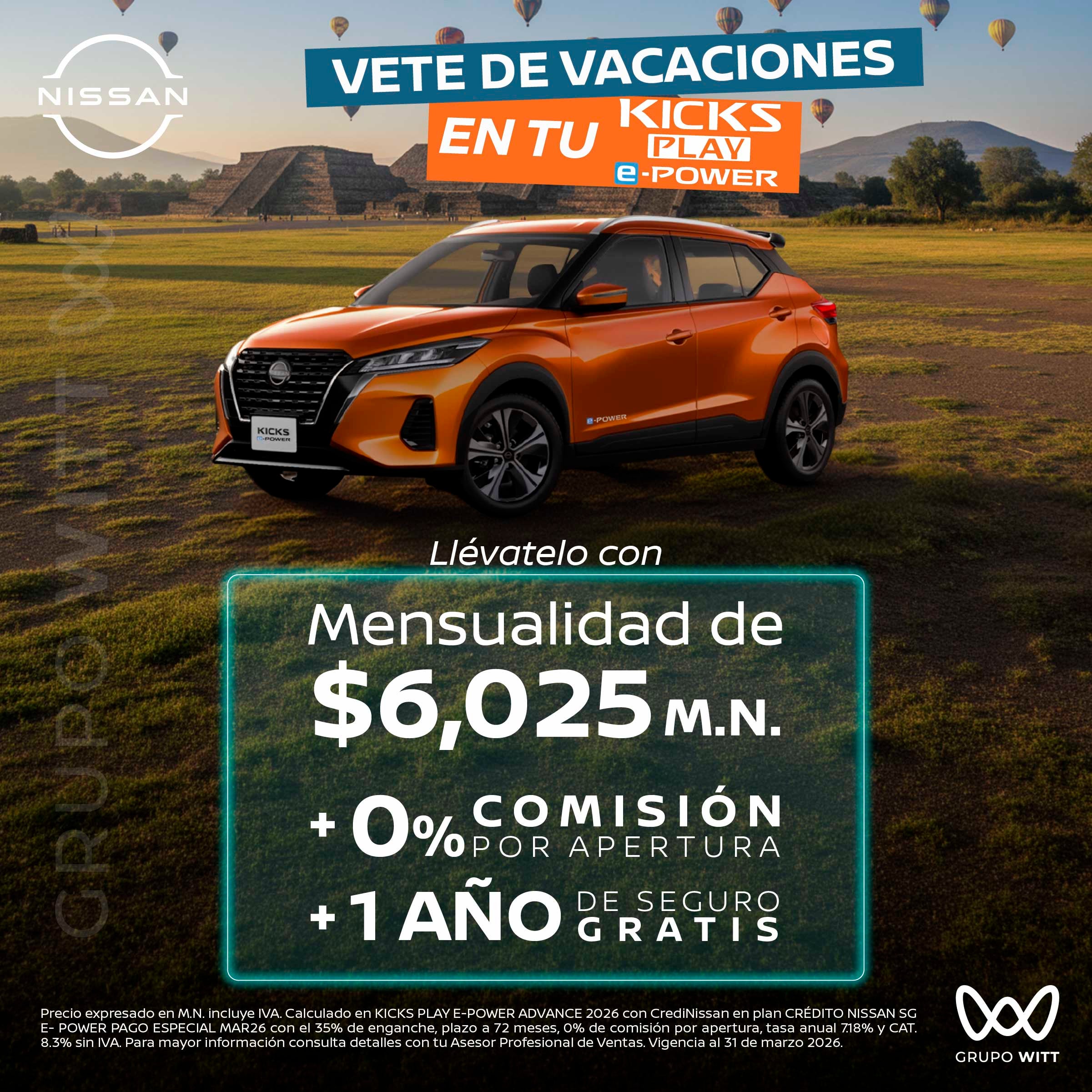 Precio expresado en M.N. incluye IVA. Calculado en KICKS PLAY E-POWER ADVANCE 2026 con CrediNissan en plan CREDITO NISSAN SG E- POWER PAGO ESPECIAL MAR26 con el 35% de enganche, plazo a 72 meses, 0% de comisión por apertura, tasa anual 718% y CAT. 8.3% sin IVA. Para mayor información consulta detalles con tu Asesor Profesional de Ventas. Vigencia al 31 de marzo 2026.