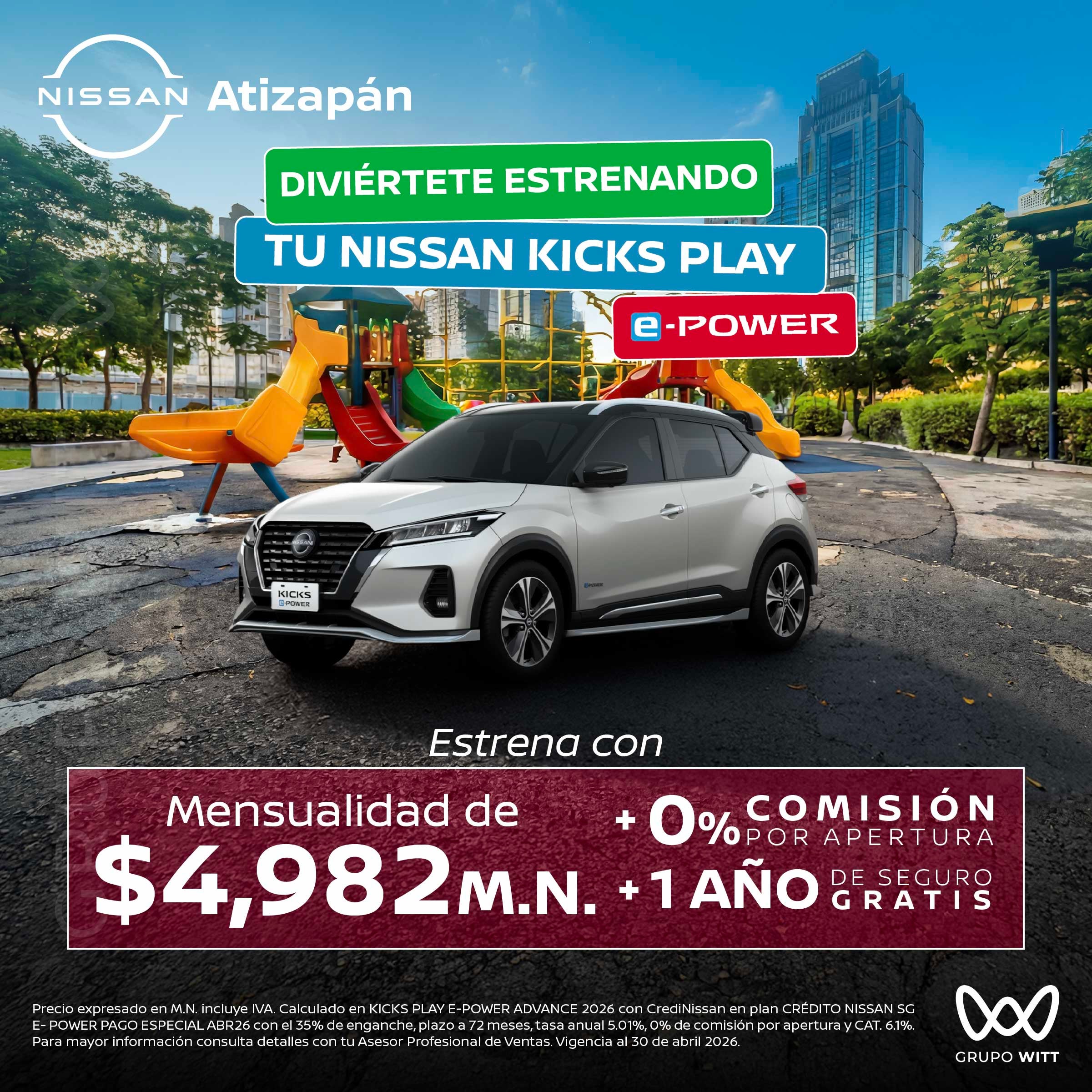 Precio expresado en M.N. incluye IVA. Calculado en KICKS PLAY E-POWER ADVANCE 2026 con CrediNissan en plan CRÉDITO NISSAN SG E-POWER PAGO ESPECIAL ABR26 con el 35% de enganche, plazo a 72 meses, tasa anual 5.01%, 0% de comisión por apertura y CAT. 6.1%. Para mayor información consulta detalles con tu Asesor Profesional de Ventas. Vigencia al 30 de abril 2026.