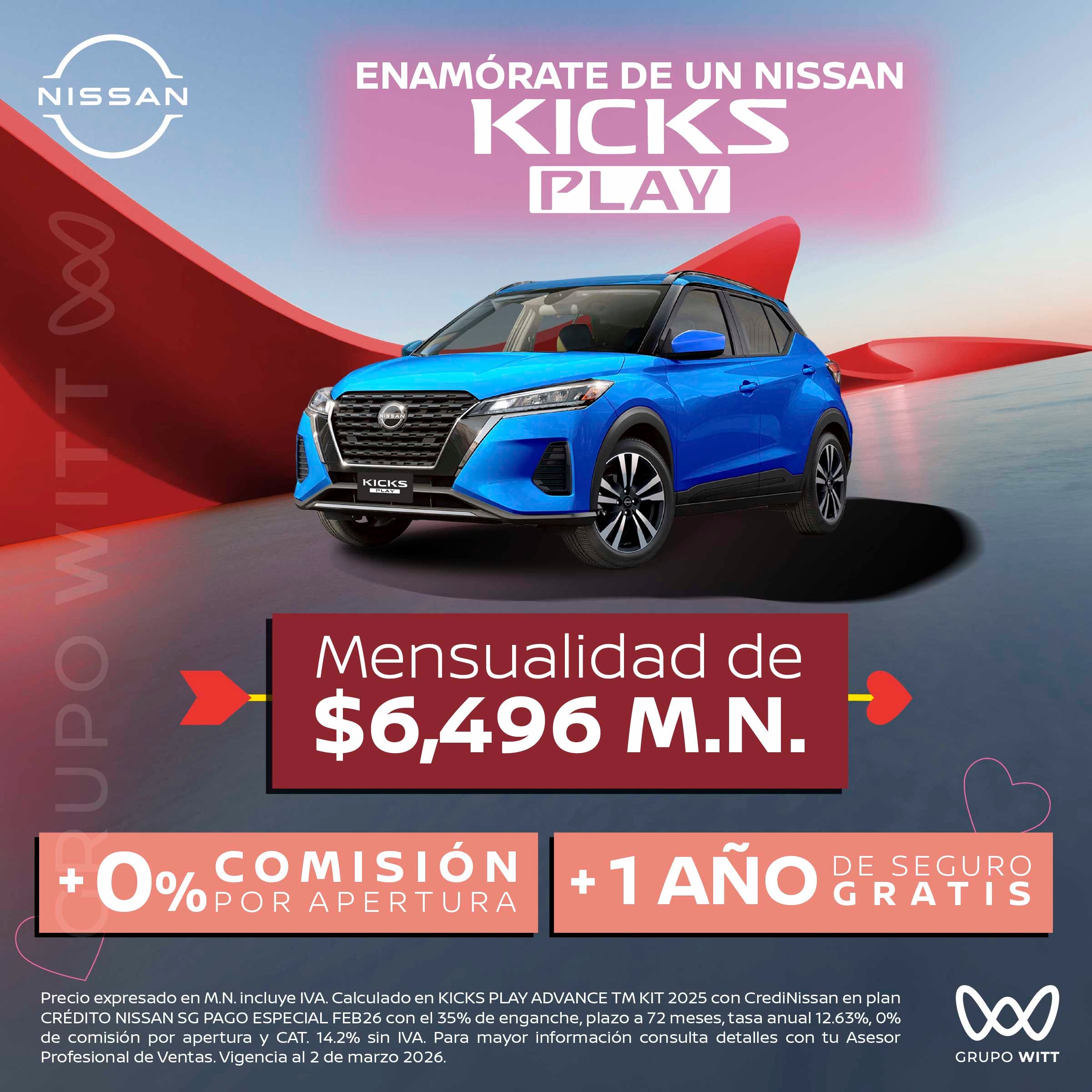 Precio expresado en M.N. incluye IVA. Calculado en KICKS PLAY ADVANCE TM KIT 2025 con CrediNissan en plan CRÉDITO NISSAN SG PAGO ESPECIAL FEB26 con el 35% de enganche, plazo a 72 meses, tasa anual 12.63%, 0% de comisión por apertura y CAT. 14.2% sin IVA. Para mayor información consulta detalles con tu Asesor Profesional de Ventas. Vigencia al 2 de marzo 2026.