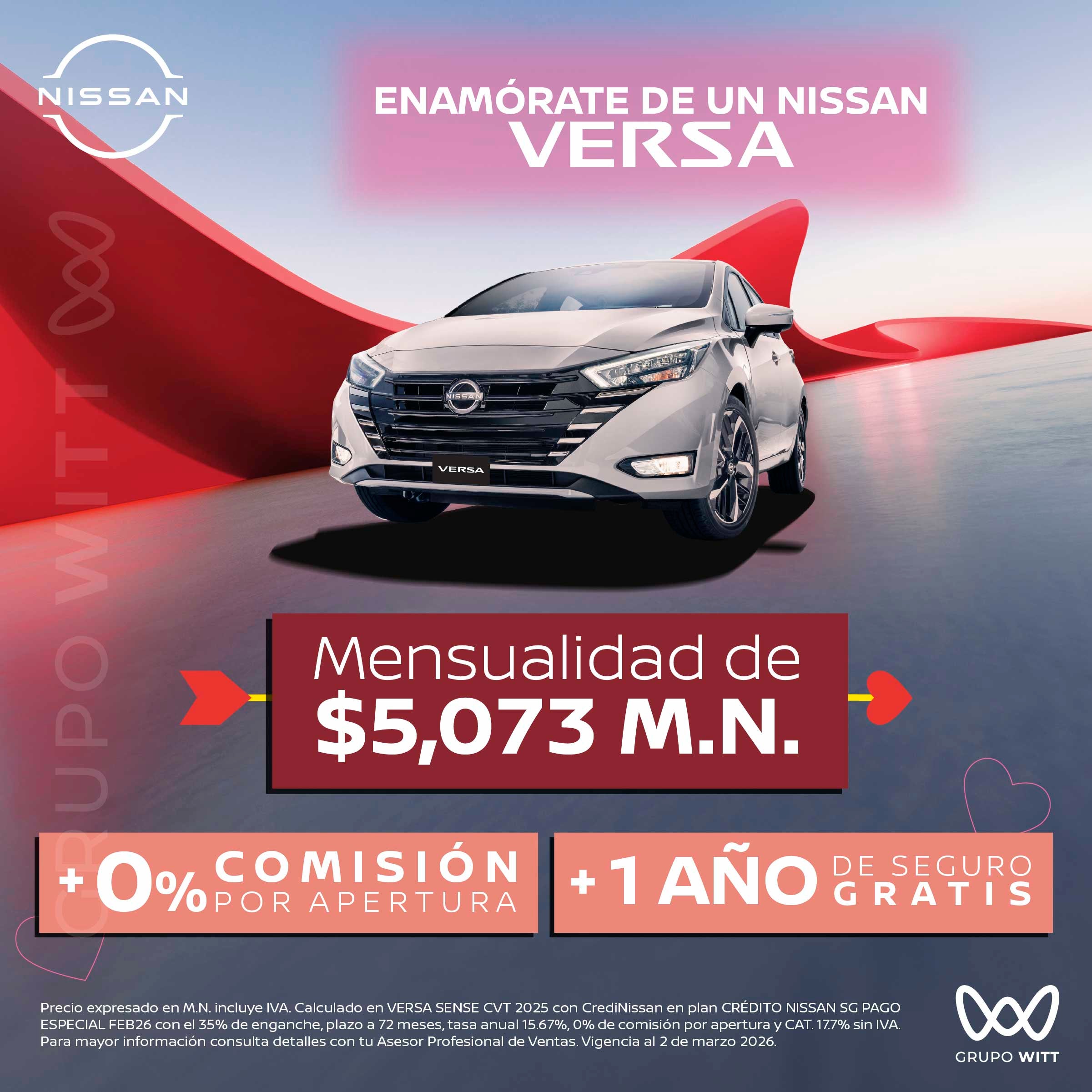 Precio expresado en M.N. incluye IVA. Calculado en VERSA SENSE CVT 2025 con CrediNissan en plan CRÉDITO NISSAN SG PAGO ESPECIAL FEB26 con el 35% de enganche, plazo a 72 meses, tasa anual 15.67%, 0% de comisión por apertura y CAT. 17.7% sin IVA. Para mayor información consulta detalles con tu Asesor Profesional de Ventas. Vigencia al 2 de marzo 2026.