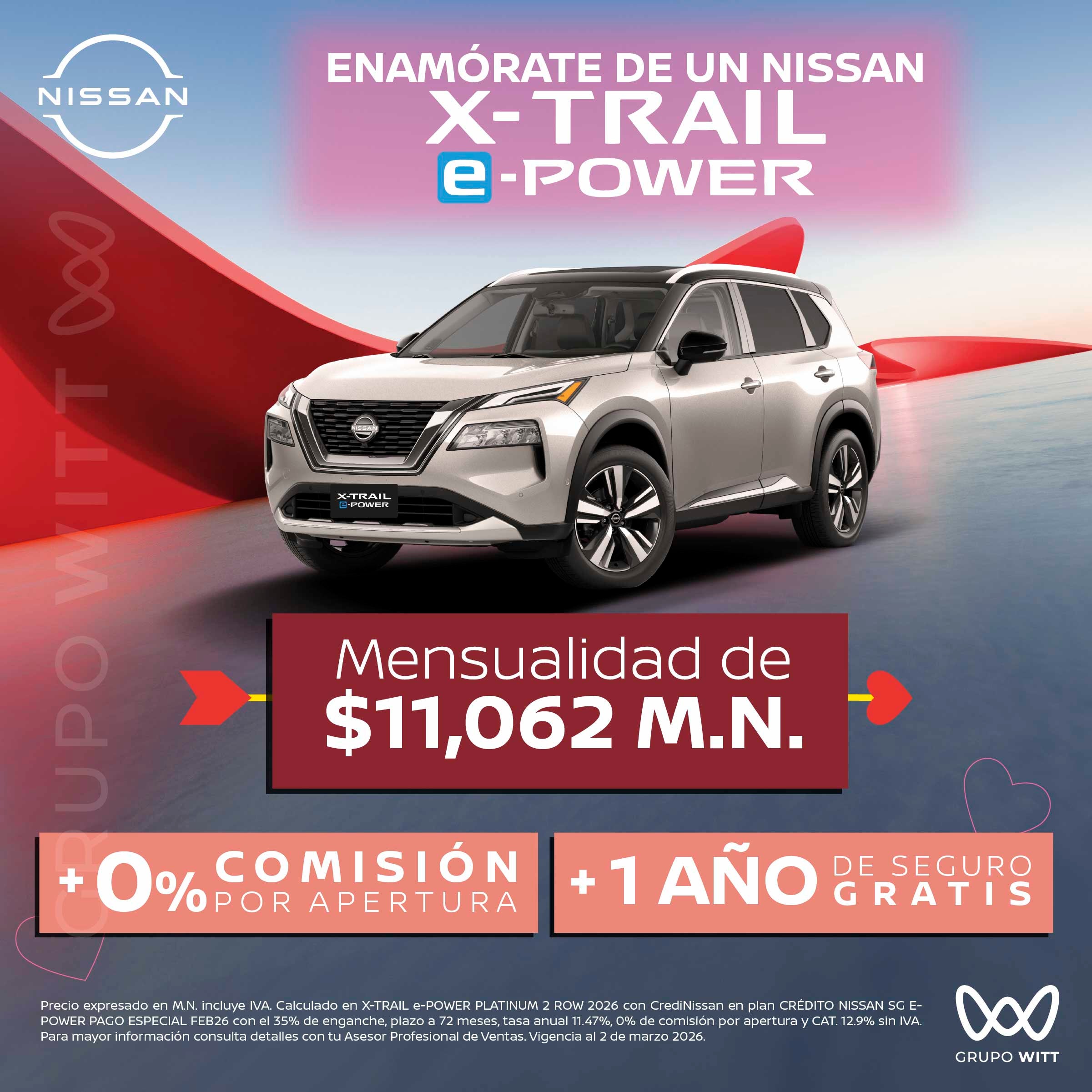 Precio expresado en M.N. incluye IVA. Calculado en X-TRAIL e-POWER PLATINUM 2 ROW 2026 con CrediNissan en plan CRÉDITO NISSAN SG E- POWER PAGO ESPECIAL FEB26 con el 35% de enganche, plazo a 72 meses, tasa anual 11.47%, 0% de comisión por apertura y CAT. 12.9% sin IVA. Para mayor información consulta detalles con tu Asesor Profesional de Ventas. Vigencia al 2 de marzo 2026.