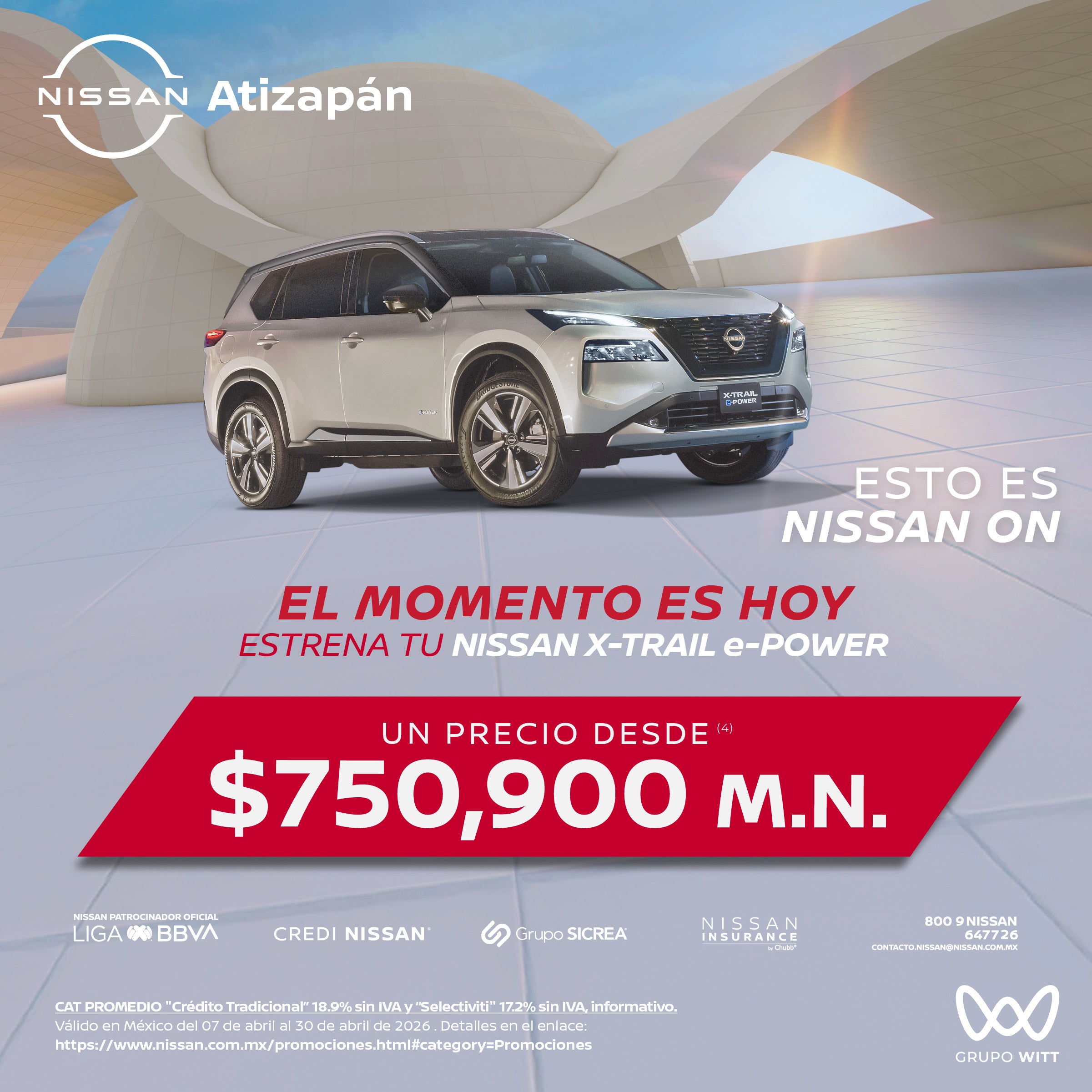 CAT PROMEDIO "Crédito Tradicional" 18.9% sin IVA y "Selectiviti" 17.2% sin IVA, informativo. Válido en México del 07 de abril al 30 de abril de 2026 . Detalles en el enlace: https://www.nissan.com.mx/promociones.html#category=Promociones