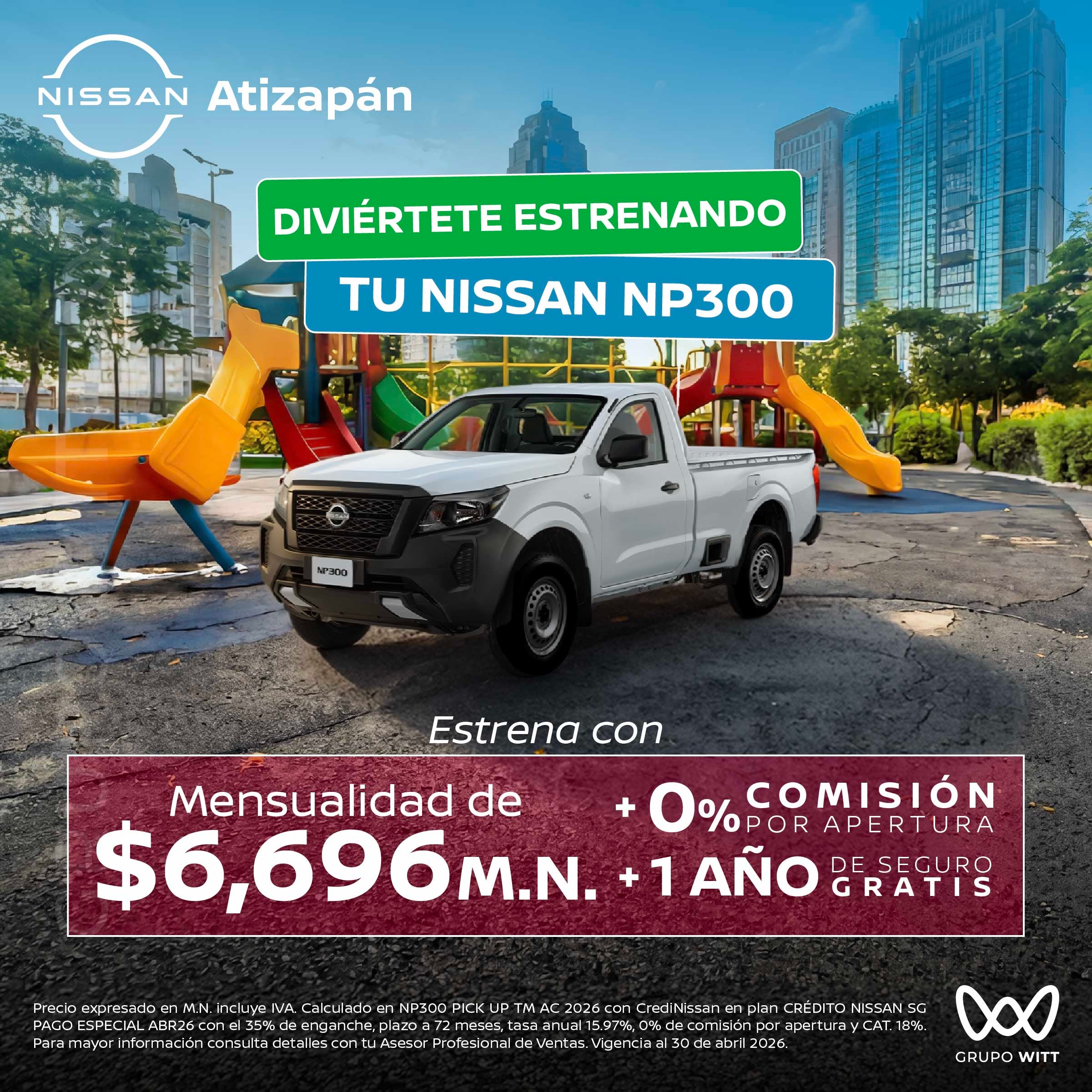 Precio expresado en M.N. incluye IVA. Calculado en NP300 PICK UP TM AC 2026 con CrediNissan en plan CRÉDITO NISSAN SG PAGO ESPECIAL ABR26 con el 35% de enganche, plazo a 72 meses, tasa anual 15.97%, 0% de comisión por apertura y CAT. 18%. Para mayor información consulta detalles con tu Asesor Profesional de Ventas. Vigencia al 30 de abril 2026.