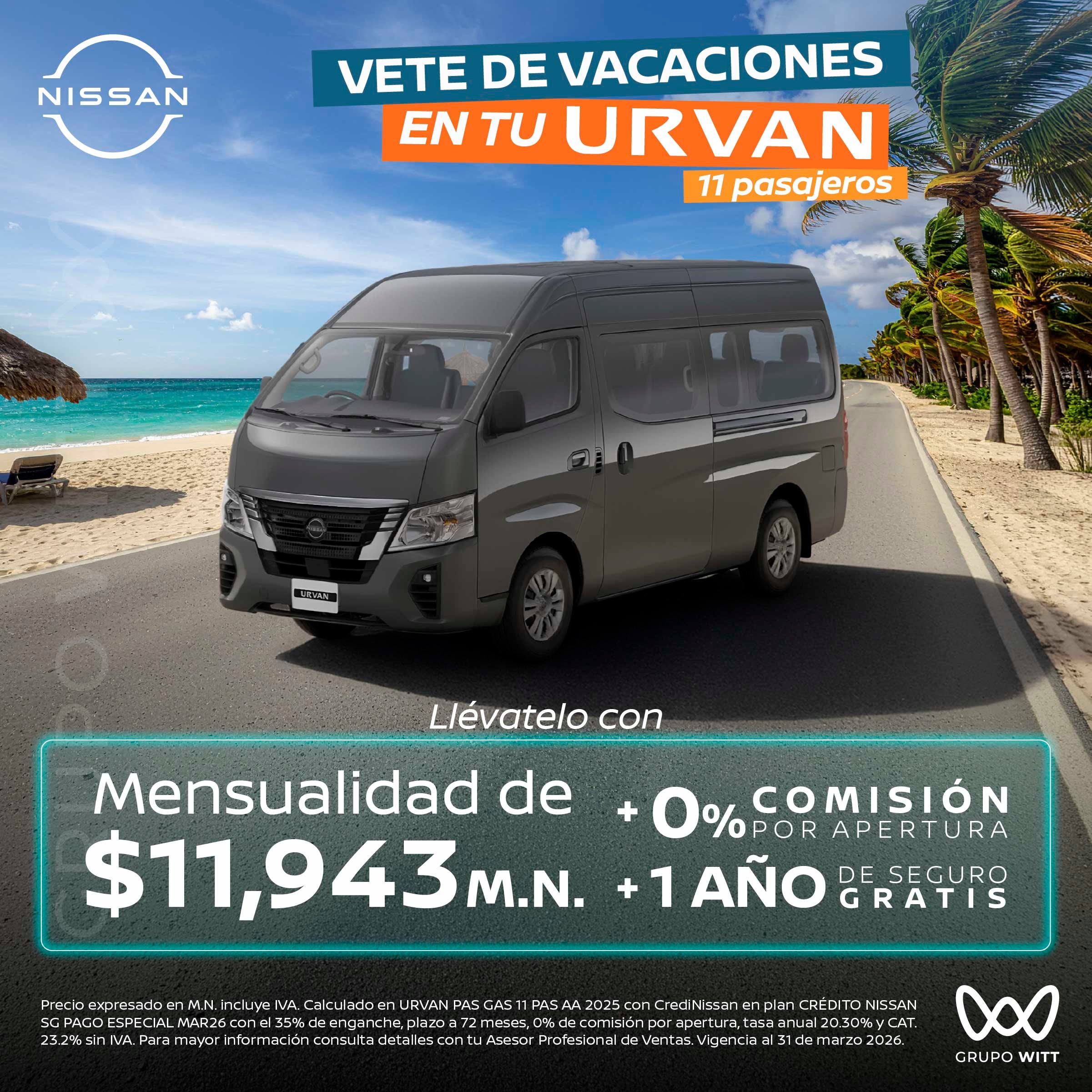 Precio expresado en M.N. incluye IVA. Calculado en URVAN PAS GAS 11 PAS AA 2025 con CrediNissan en plan CRÉDITO NISSAN SG PAGO ESPECIAL MAR26 con el 35% de enganche, plazo a 72 meses, 0% de comisión por apertura, tasa anual 20.30% y CAT. 23.2% sin IVA. Para mayor información consulta detalles con tu Asesor Profesional de Ventas. Vigencia al 31 de marzo 2026.
