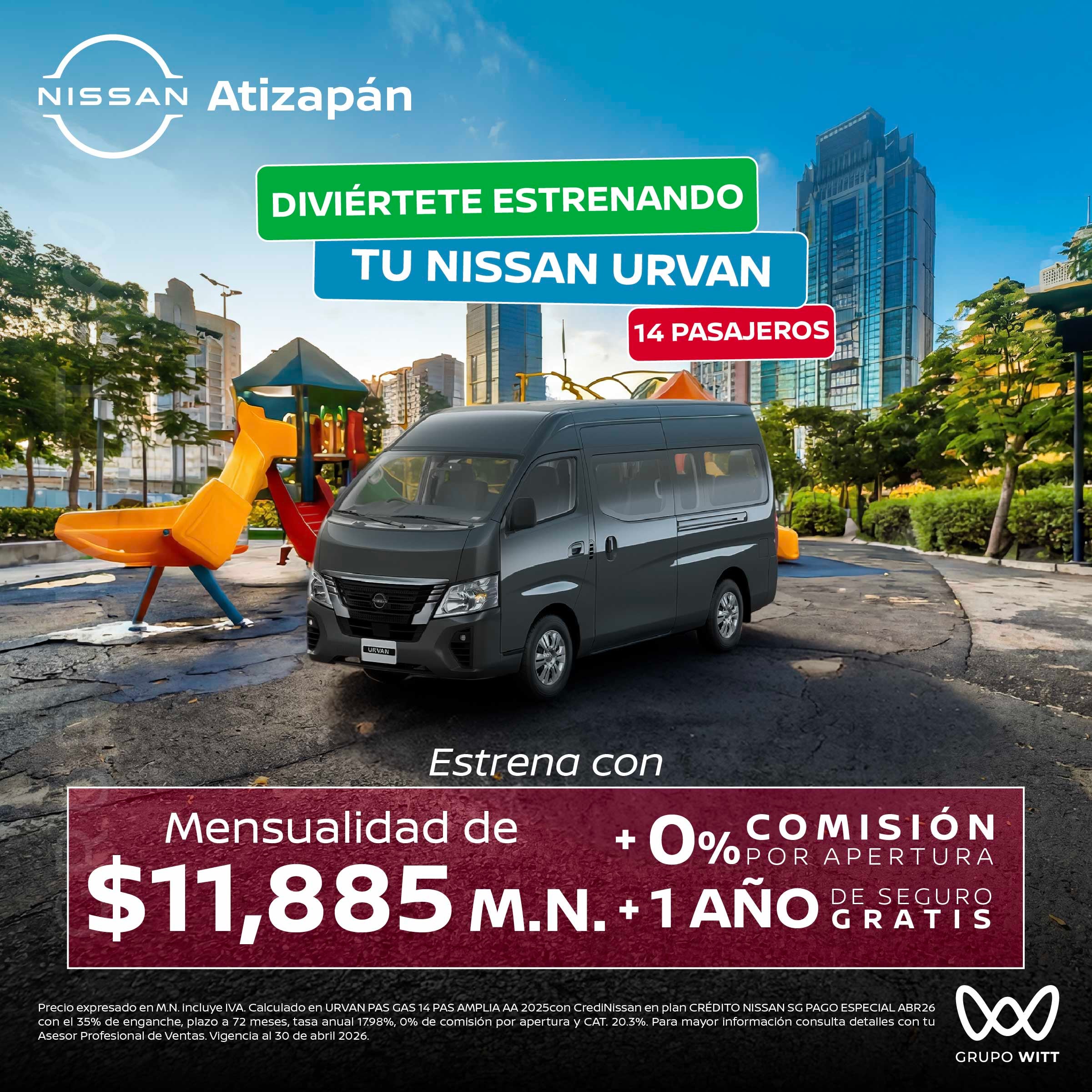 Precio expresado en M.N. incluye IVA. Calculado en URVAN PAS GAS 14 PAS AMPLIA AA 2025con CrediNissan en plan CRÉDITO NISSAN SG PAGO ESPECIAL ABR26 con el 35% de enganche, plazo a 72 meses, tasa anual 1798%, 0% de comisión por apertura y CAT. 20.3%. Para mayor información consulta detalles con tu Asesor Profesional de Ventas. Vigencia al 30 de abril 2026.