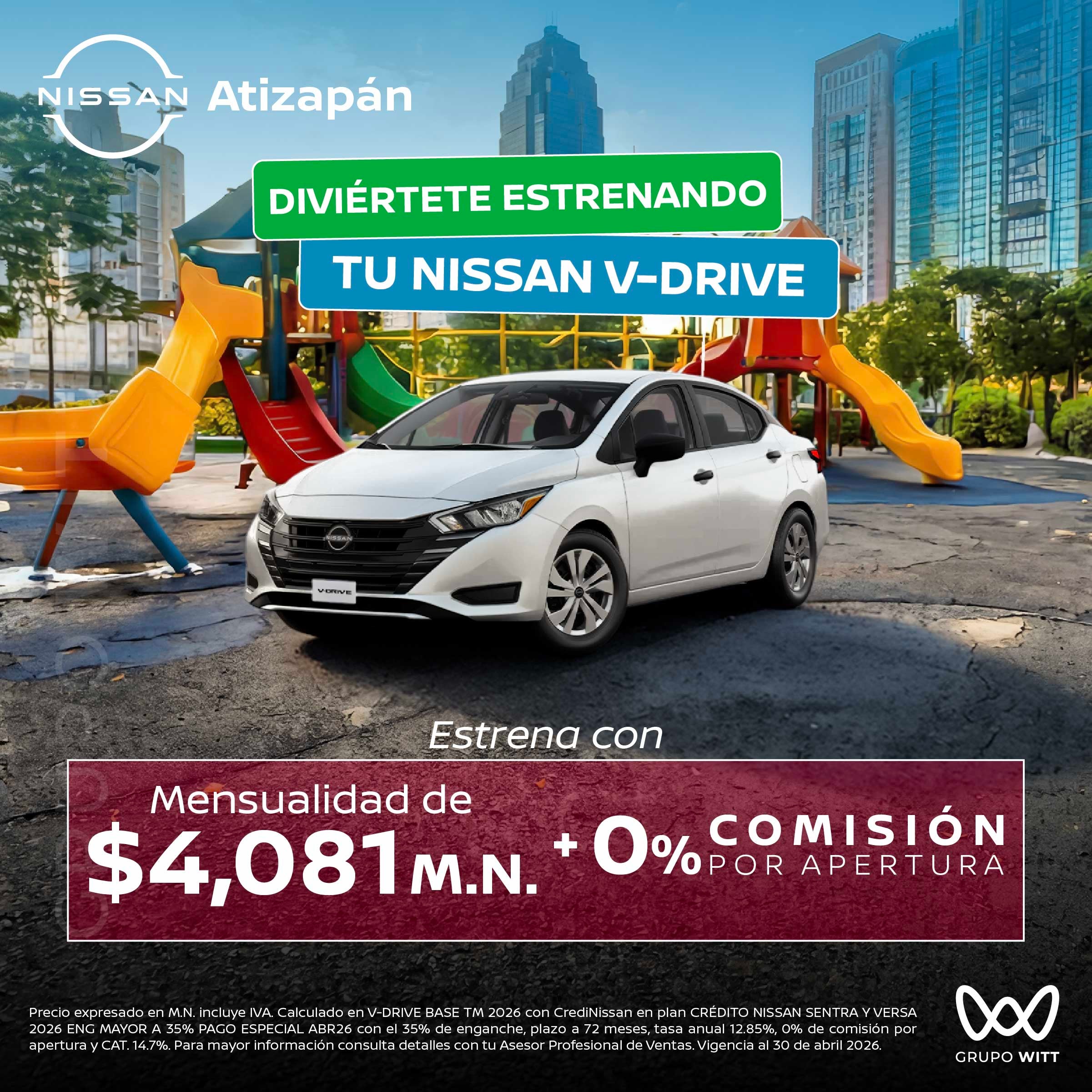 Precio expresado en M.N. incluye IVA. Calculado en V-DRIVE BASE TM 2026 con CrediNissan en plan CREDITO NISSAN SENTRA Y VERSA 2026 ENG MAYOR A 35% PAGO ESPECIAL ABR26 con el 35% de enganche, plazo a 72 meses, tasa anual 12.85%, 0% de comisión por apertura y CAT. 14.7%. Para mayor información consulta detalles con tu Asesor Profesional de Ventas. Vigencia al 30 de abril 2026.