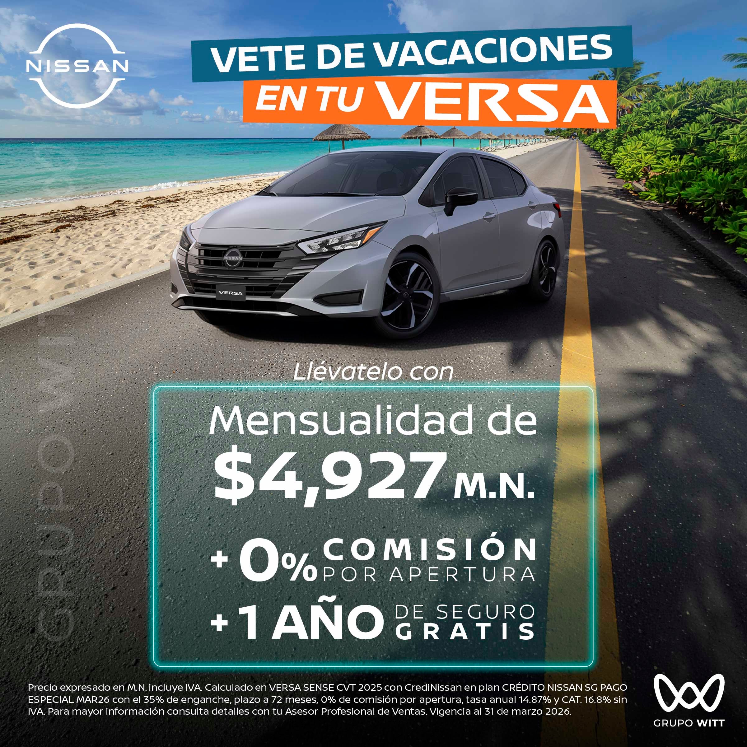 Precio expresado en M.N. incluye IVA. Calculado en VERSA SENSE CVT 2025 con CrediNissan en plan CRÉDITO NISSAN SG PAGO ESPECIAL MAR26 con el 35% de enganche, plazo a 72 meses, 0% de comisión por apertura, tasa anual 14.87% y CAT. 16.8% sin IVA. Para mayor información consulta detalles con tu Asesor Profesional de Ventas. Vigencia al 31 de marzo 2026.