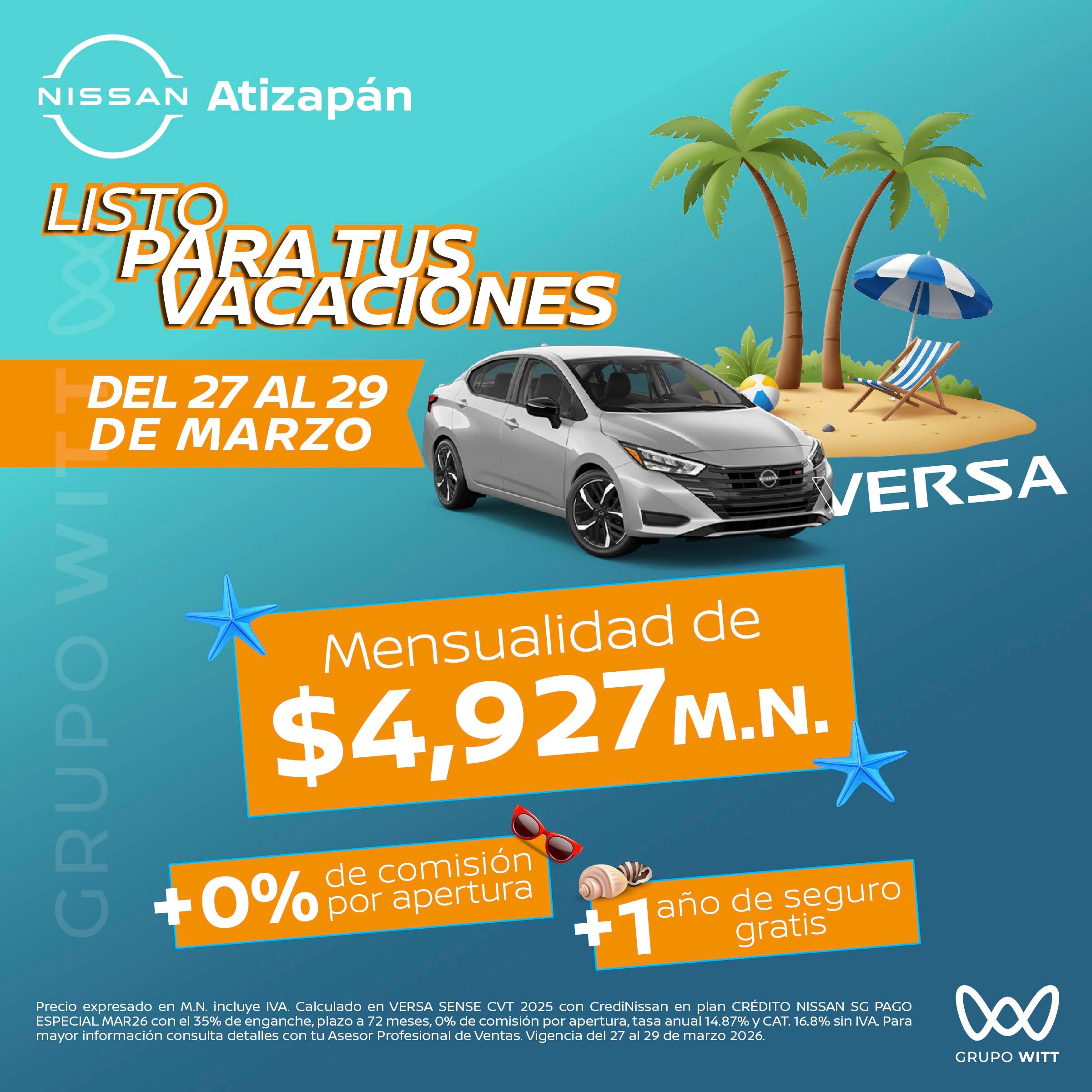 Precio expresado en M.N. incluye IVA. Calculado en VERSA SENSE CVT 2025 con CrediNissan en plan CRÉDITO NISSAN SG PAGO ESPECIAL MAR26 con el 35% de enganche, plazo a 72 meses, 0% de comisión por apertura, tasa anual 14.87% y CAT. 16.8% sin IVA. Para mayor información consulta detalles con tu Asesor Profesional de Ventas. Vigencia del 27 al 29 de marzo 2026.