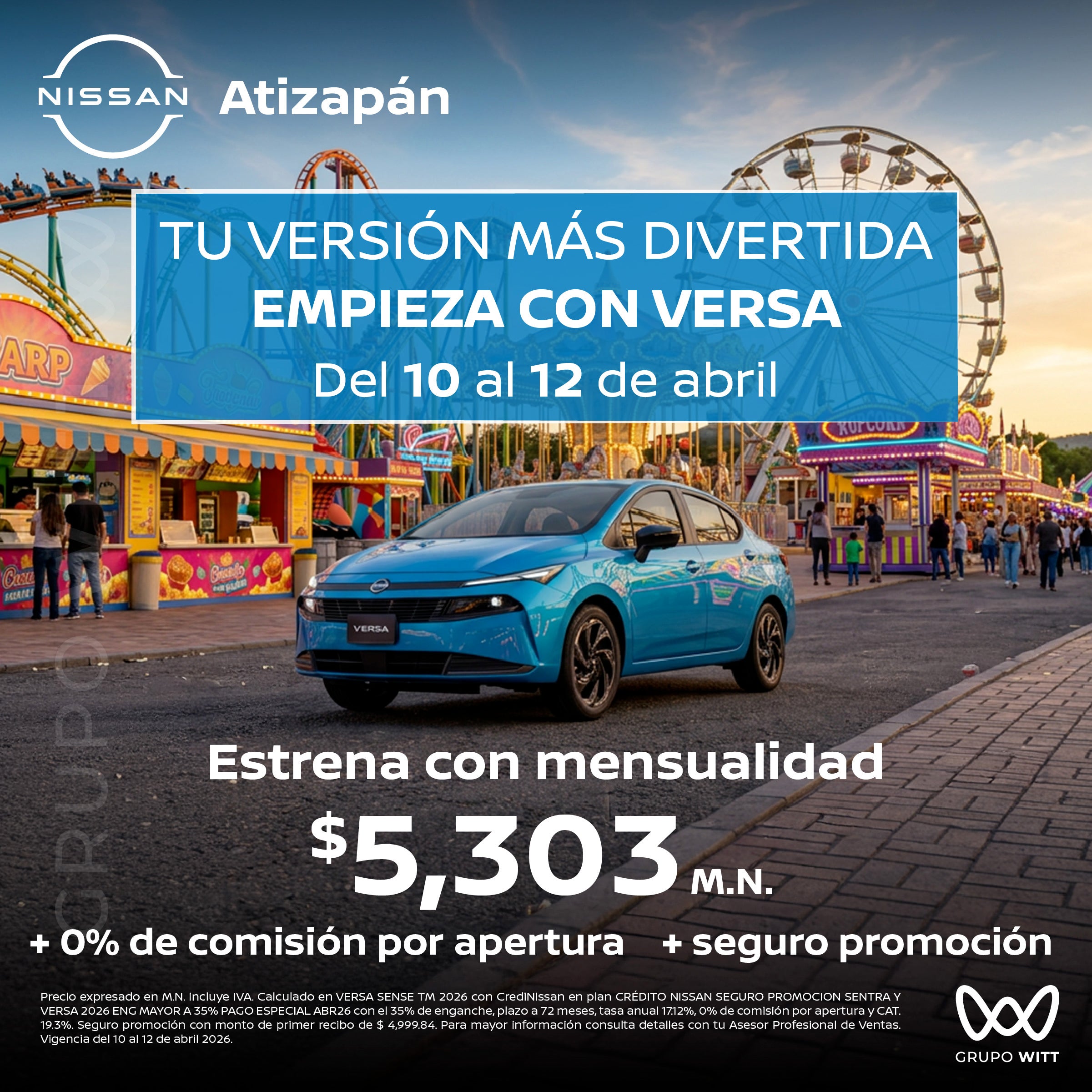 Precio expresado en M.N. incluye IVA. Calculado en VERSA SENSE TM 2026 con CrediNissan en plan CRÉDITO NISSAN SEGURO PROMOCION SENTRA Y VERSA 2026 ENG MAYOR A 35% PAGO ESPECIAL ABR26 con el 35% de enganche, plazo a 72 meses, tasa anual 17.12%, 0% de comisión por apertura y CAT. 19.3%. Seguro promoción con monto de primer recibo de $ 4,999.84. Para mayor información consulta detalles con tu Asesor Profesional de Ventas. Vigencia del 10 al 12 de abril 2026.