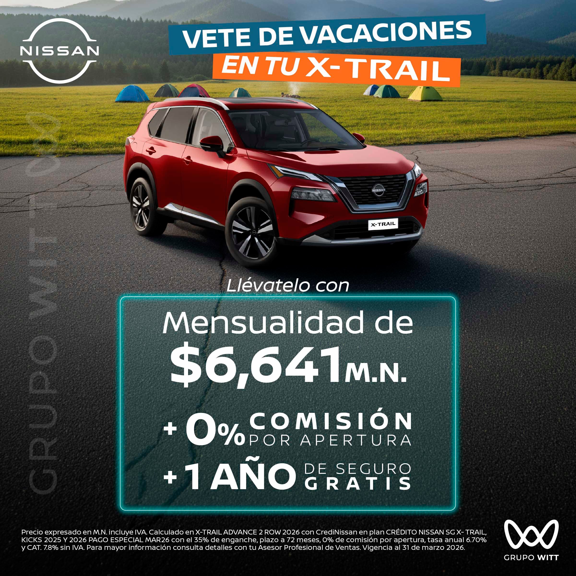 Precio expresado en M.N. incluye IVA. Calculado en X-TRAIL ADVANCE 2 ROW 2026 con CrediNissan en plan CRÉDITO NISSAN SG X- TRAIL, KICKS 2025 Y 2026 PAGO ESPECIAL MAR26 con el 35% de enganche, plazo a 72 meses, 0% de comisión por apertura, tasa anual 6.70% y CAT. 7.8% sin IVA. Para mayor información consulta detalles con tu Asesor Profesional de Ventas. Vigencia al 31 de marzo 2026.
