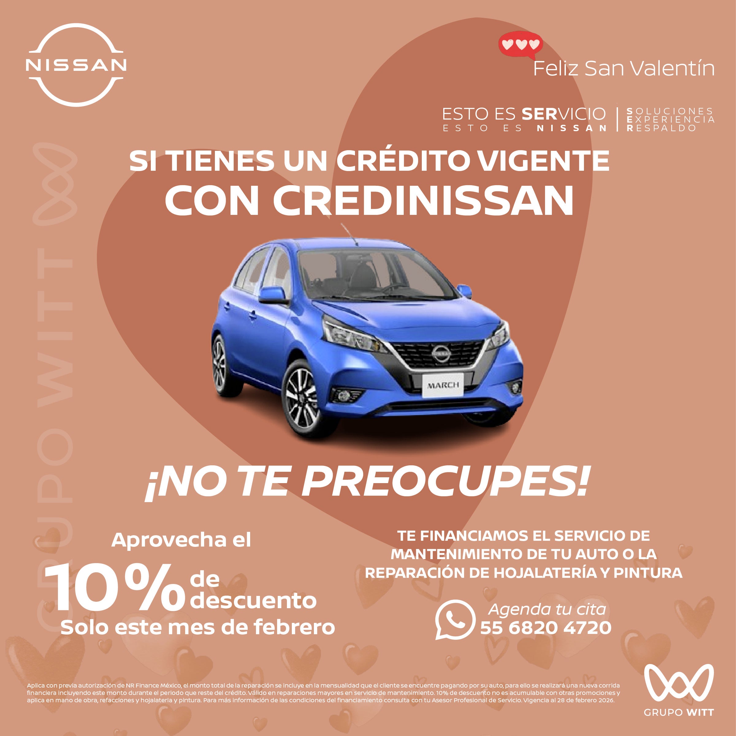Aplica con previa autorización de NR Finance México, el monto total de la reparación se Incluye en la mensualidad que el cliente se encuentre pagando por su auto, para ello se realizará una nueva corrida financiera Incluyendo este monto durante el periodo que reste del crédito. Válido en reparaciones mayores en servicio de mantenimiento. 10% de descuento no es acumulable con otras promociones y aplica en mano de obra, refacciones y hojalatería y pintura. Para más Información de las condiciones del financiamiento consulta con tu Asesor Profesional de Servicio. Vigencia a 28 de febrero 2026.