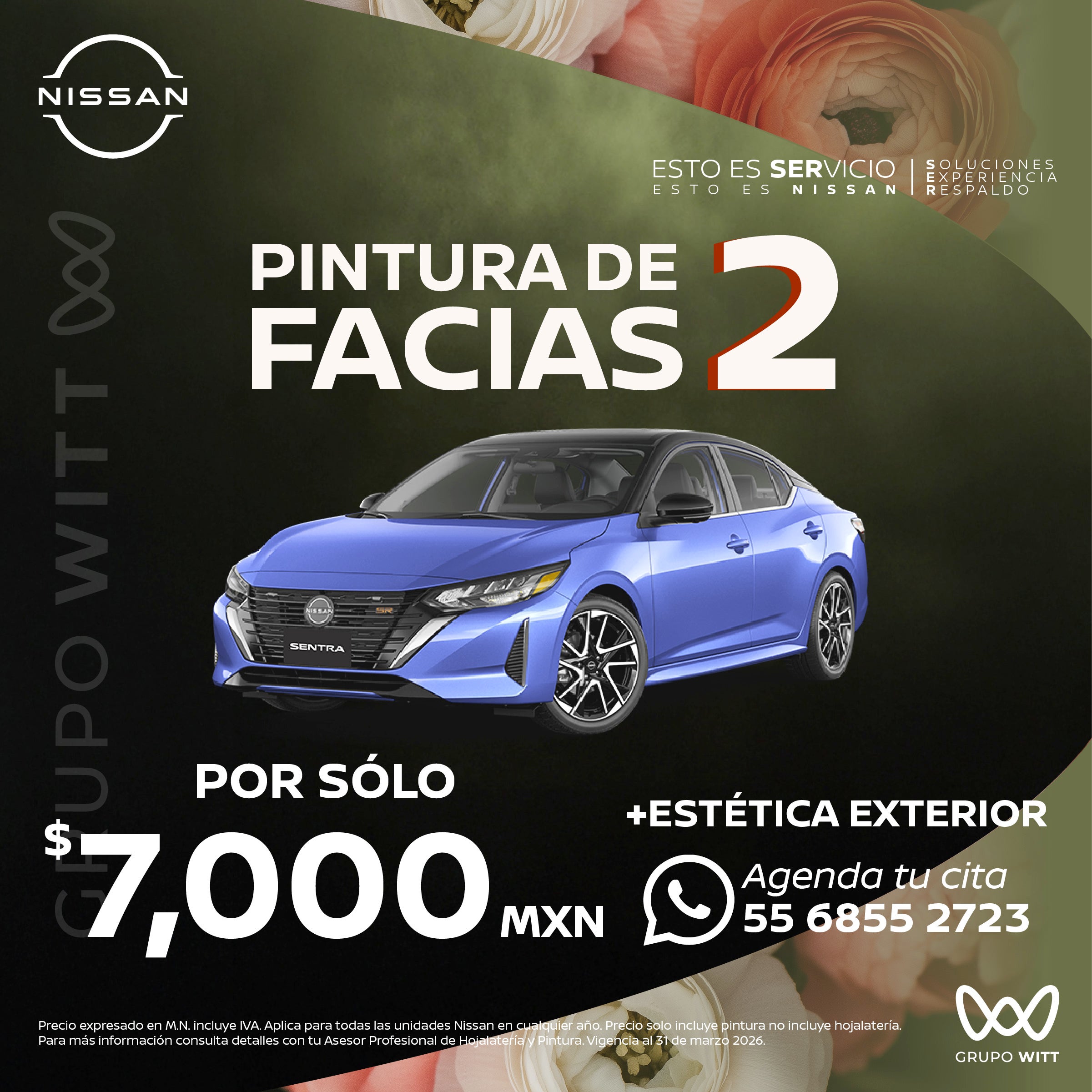 Precio expresado en M.N. incluye IVA. Aplica para todas las unidades Nissan en cualquier año. Precio solo incluye pintura no incluye hojalatería. Para más información consulta detalles con tu Asesor Profesional de Hojalatería y Pintura. Vigencia al 31 de marzo 2026.