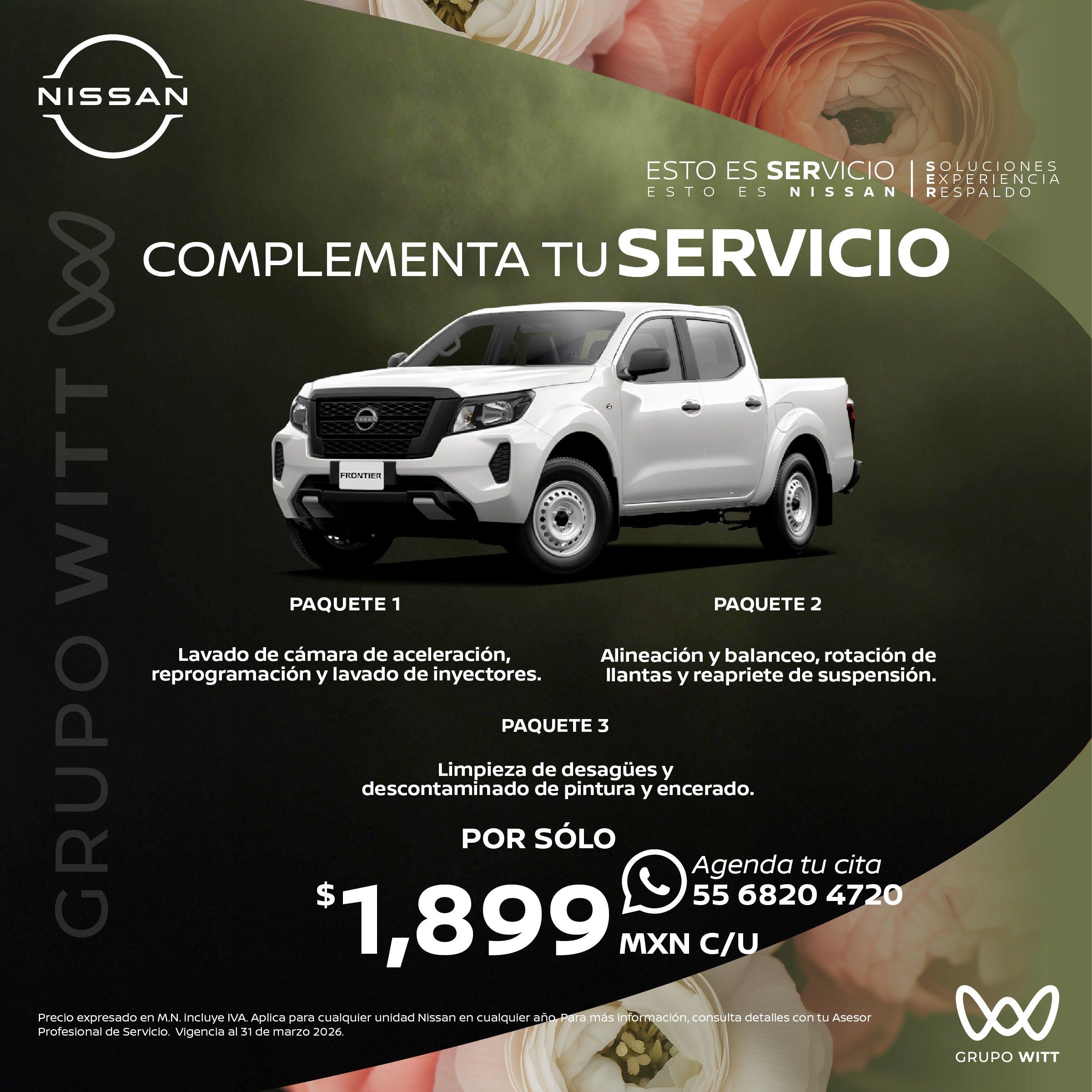 Precio expresado en M.N. incluye IVA. Aplica para cualquier unidad Nissan en cualquier año Para más información, consulta detalles con tu Asesor Profesional de Servicio. Vigencia al 31 de marzo 2026.