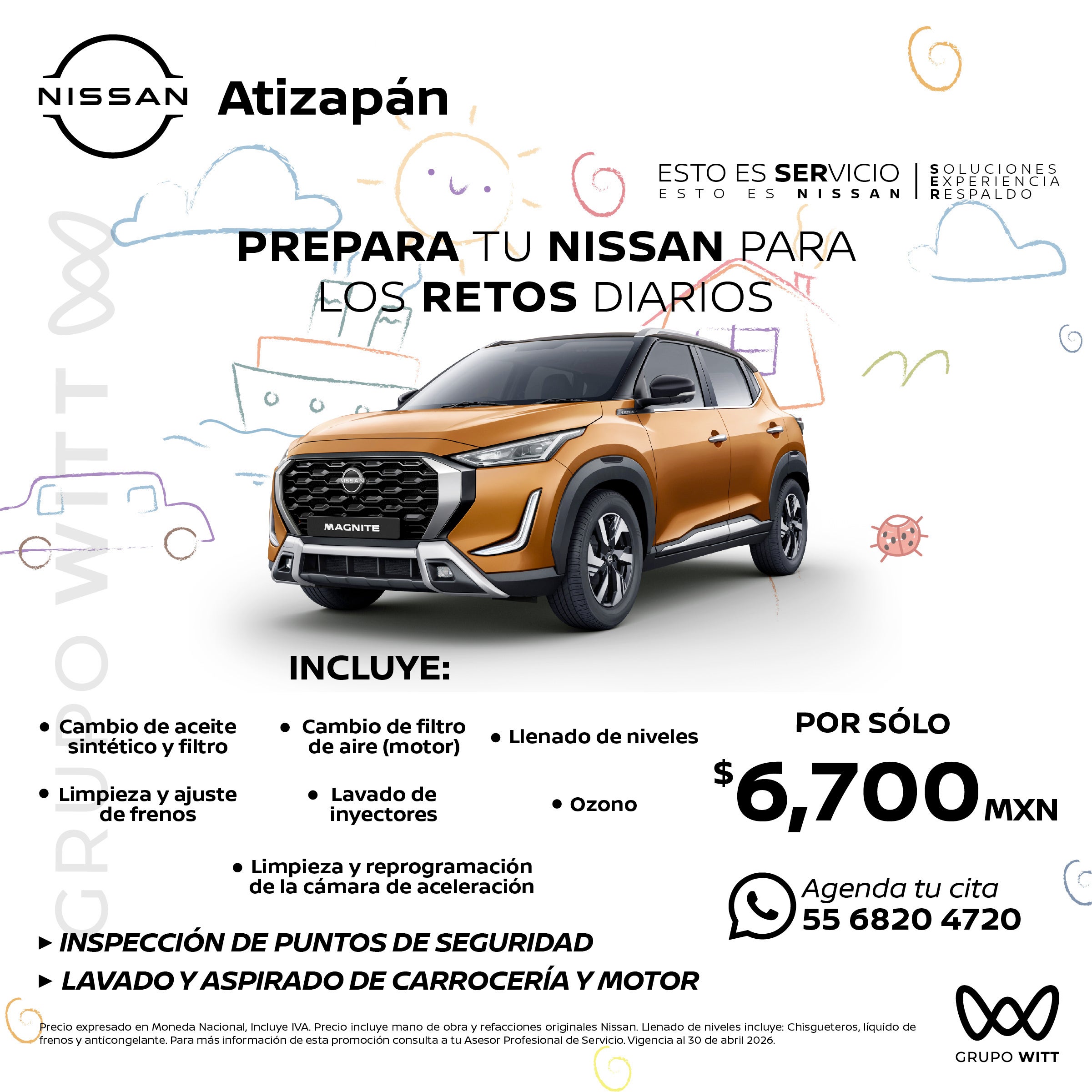 Precio expresado en Moneda Nacional, Incluye IVA. Precio incluye mano de obra y refacciones originales Nissan. Llenado de niveles incluye: Chisgueteros, líquido de frenos y anticongelante. Para más información de esta promoción consulta a tu Asesor Profesional de Servicio. Vigencia al 30 de abril 2026.
