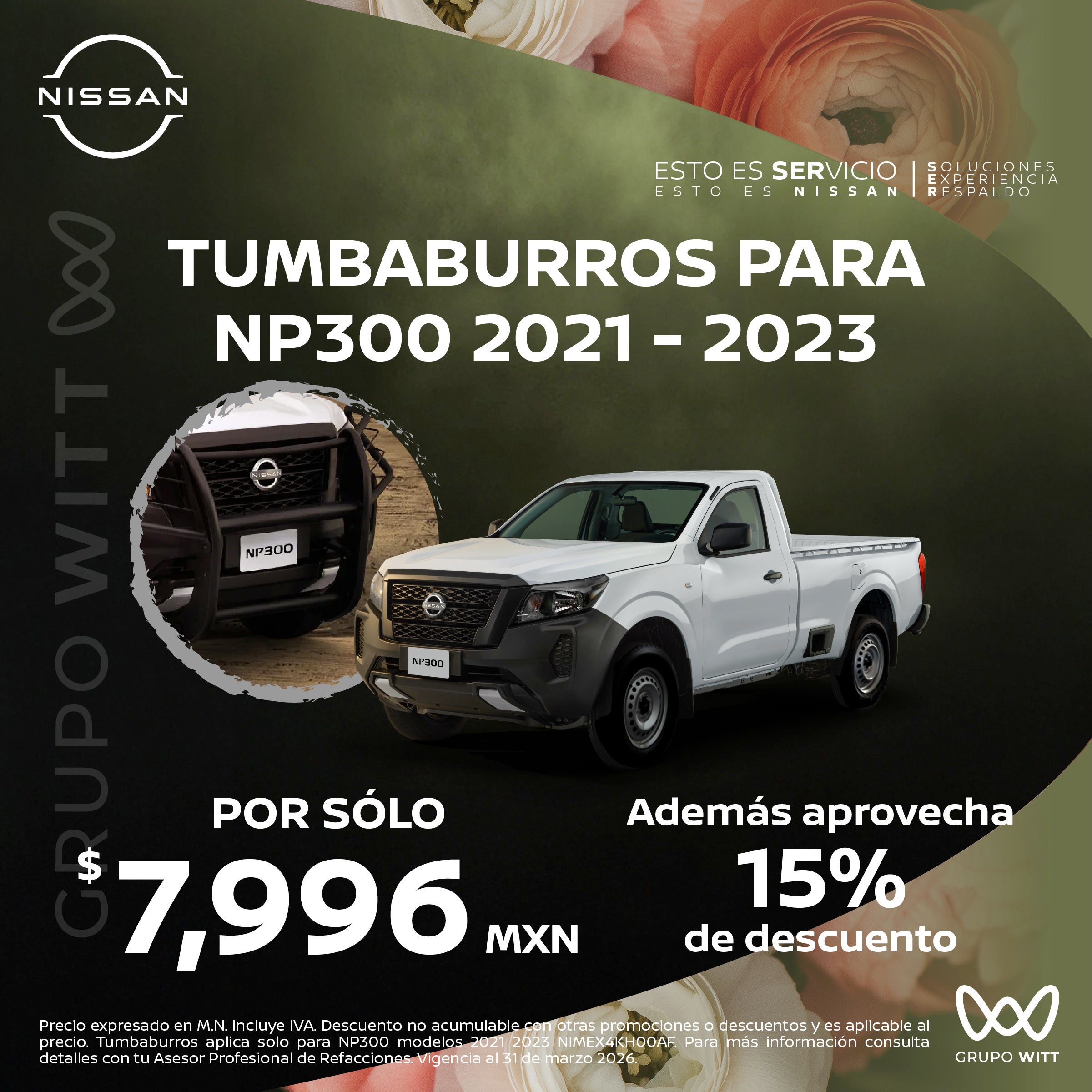 Precio expresado en M.N. incluye IVA. Descuento no acumulable con otras promociones o descuentos y es aplicable al precio. Tumbaburros aplica solo para NP300 modelos 2021 2023 NIMEX4KHOOAF. Para más información consulta detalles con tu Asesor Profesional de Refacciones. Vigencia al 31 de marzo 2026.