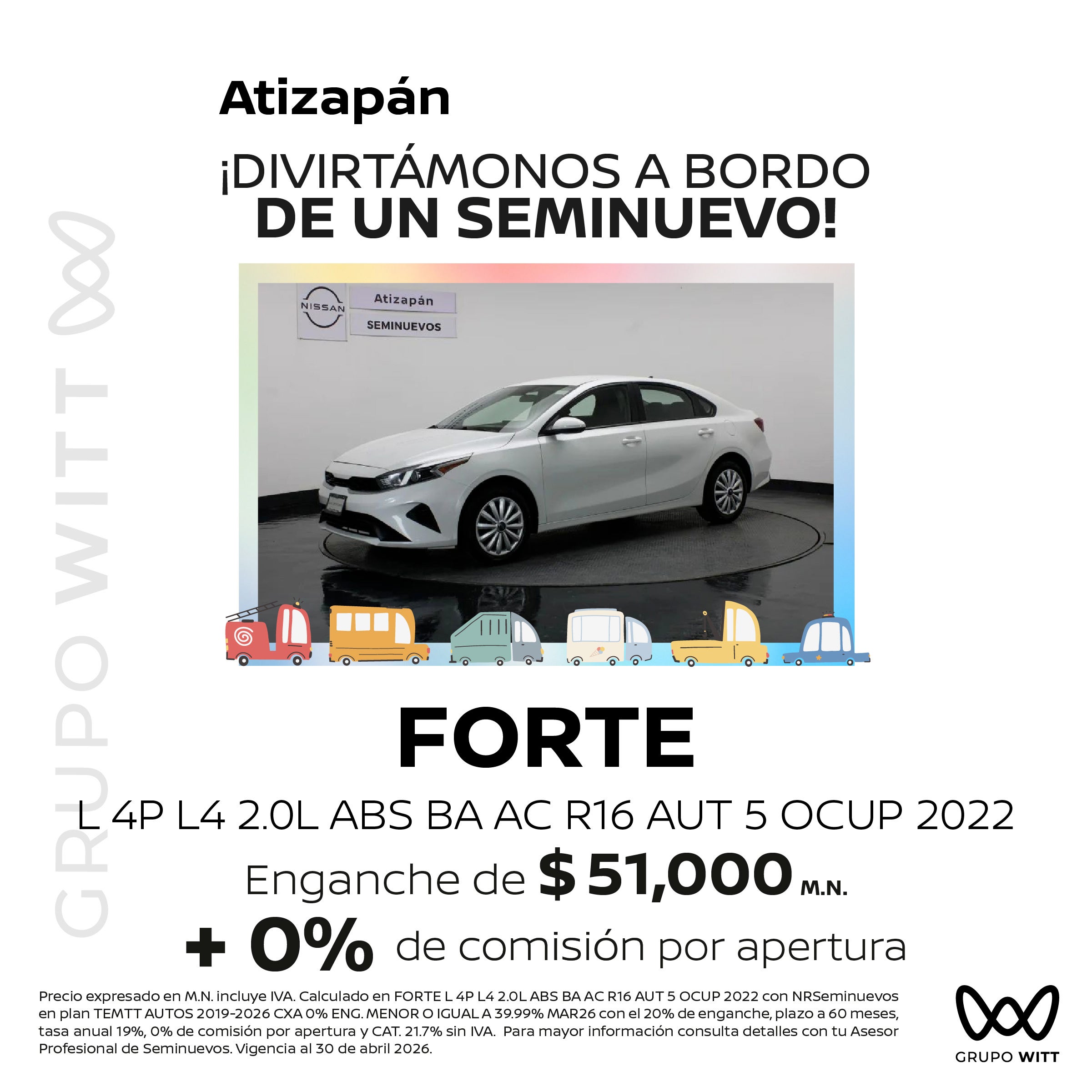 Precio expresado en M.N. incluye IVA. Calculado en FORTE L 4P L4 2.0L ABS BA AC R16 AUT 5 OCUP 2022 con NRSeminuevos en plan TEMTT AUTOS 2019-2026 CXA 0% ENG. MENOR O IGUAL A 39.99% MAR26 con el 20% de enganche, plazo a 60 meses, tasa anual 19%, 0% de comisión por apertura y CAT. 21.7% sin IVA. Para mayor información consulta detalles con tu Asesor Profesional de Seminuevos. Vigencia al 30 de abril 2026.