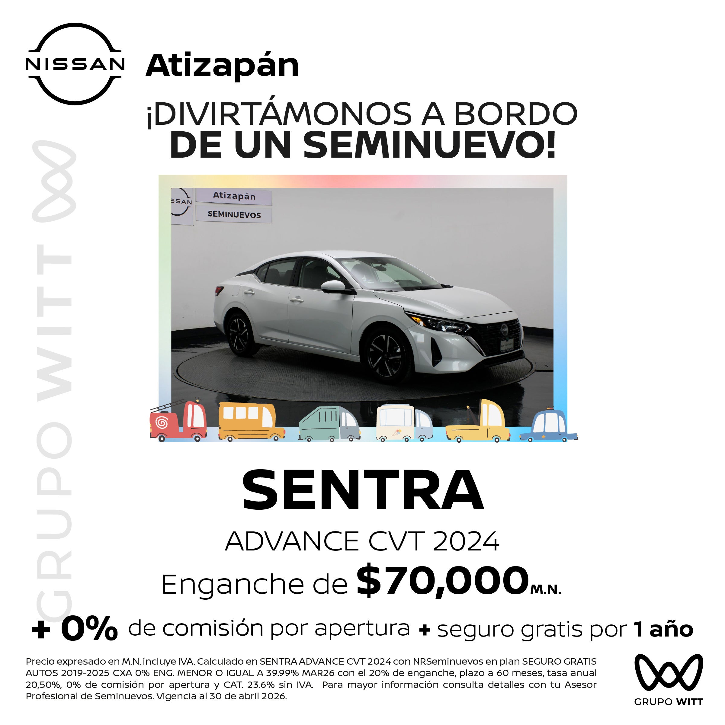 Precio expresado en M.N. incluye IVA. Calculado en SENTRA ADVANCE CVT 2024 con NRSeminuevos en plan SEGURO GRATIS AUTOS 2019-2025 CXA 0% ENG. MENOR O IGUAL A 39.99% MAR26 con el 20% de enganche, plazo a 60 meses, tasa anual 20,50%, 0% de comisión por apertura y CAT. 23.6% sin IVA. Para mayor información consulta detalles con tu Asesor Profesional de Seminuevos. Vigencia al 30 de abril 2026.