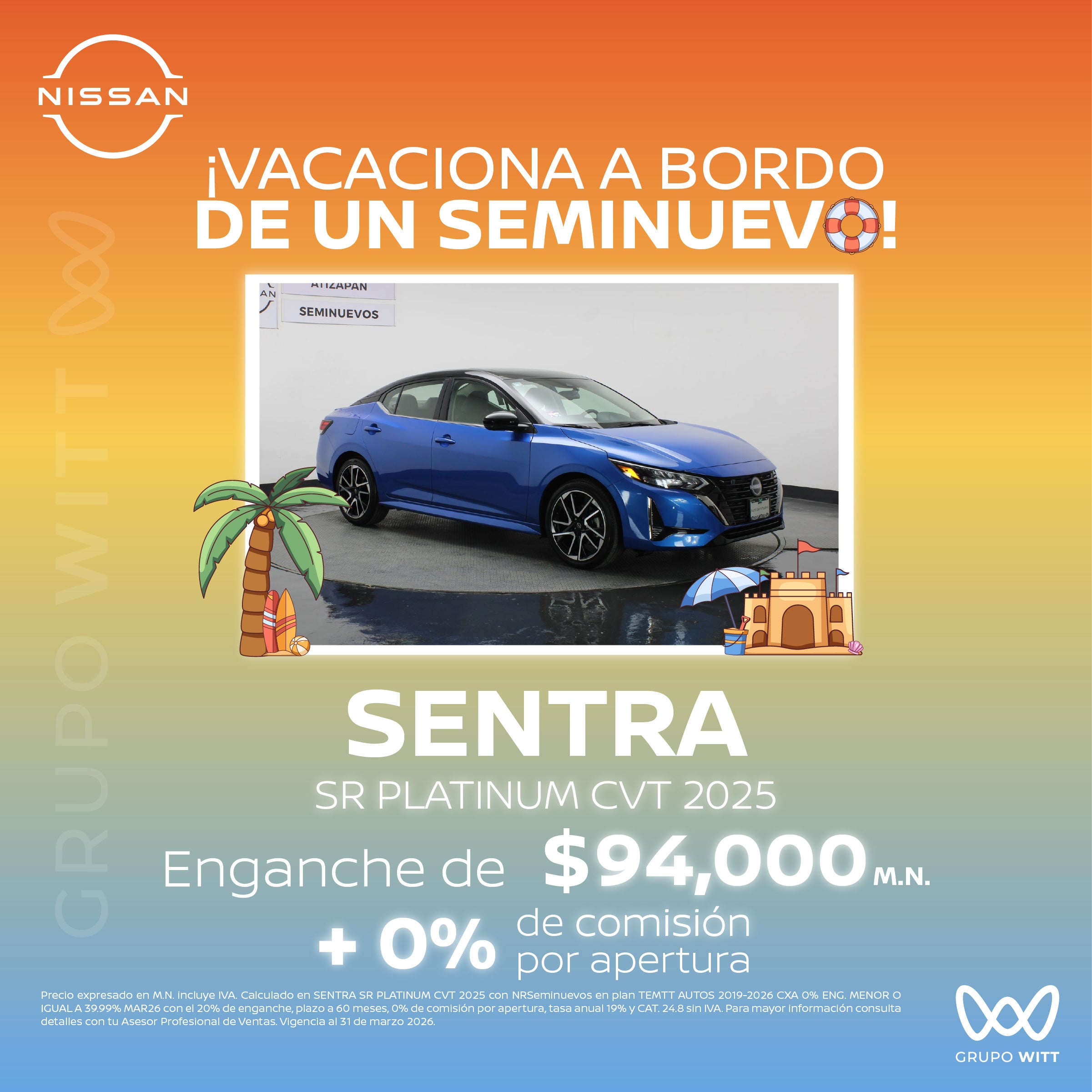 Precio expresado en M.N. incluye IVA. Calculado en SENTRA SR PLATINUM CVT 2025 con NRSeminuevos en plan TEMTT AUTOS 2019-2026 CXA 0% ENG. MENOR O IGUAL A 39.99% MAR26 con el 20% de enganche, plazo a 60 meses, 0% de comisión por apertura, tasa anual 19% y CAT. 24.8 sin IVA. Para mayor información consulta detalles con tu Asesor Profesional de Ventas. Vigencia al 31 de marzo 2026.