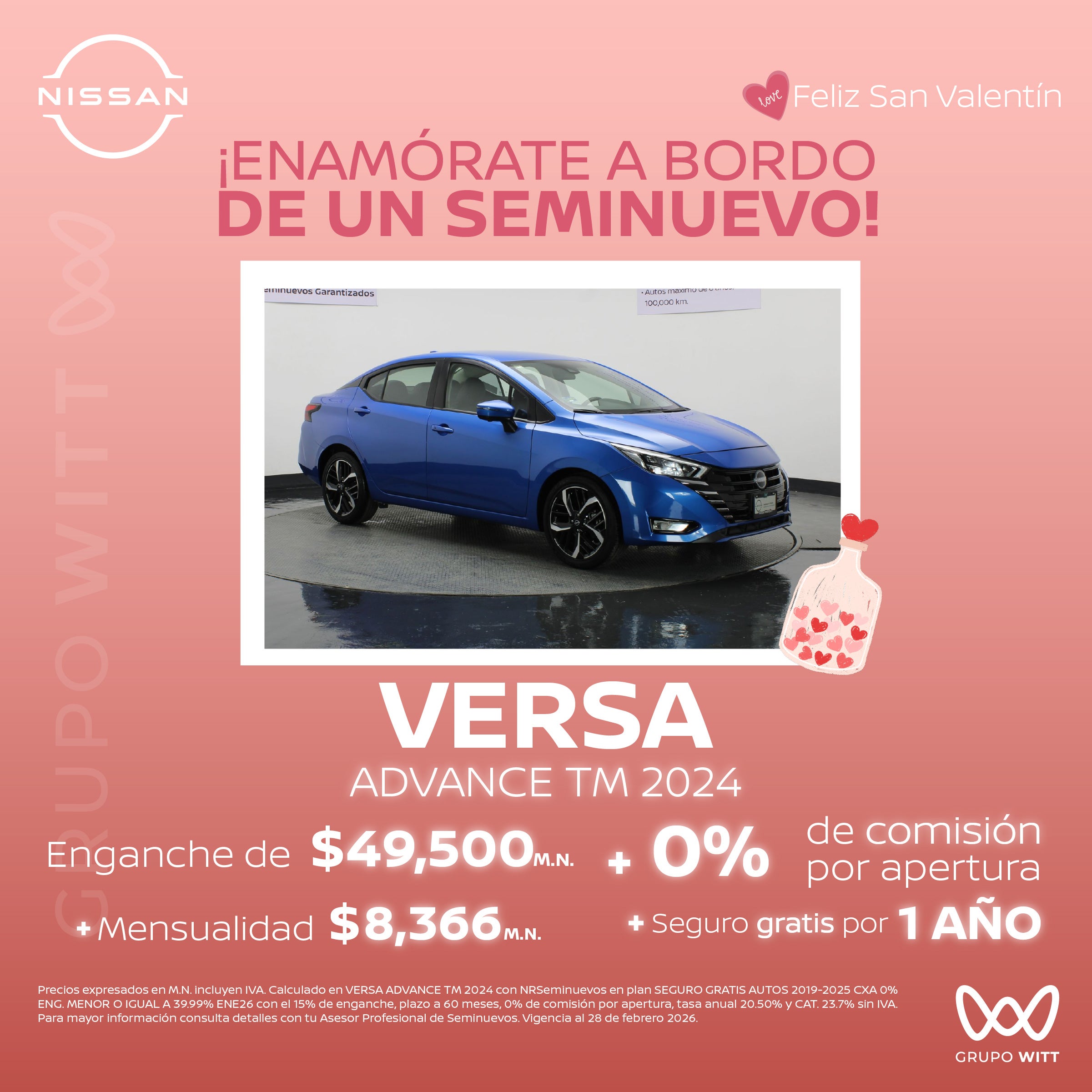 Precios expresados en M.N. incluyen IVA. Calculado en VERSA ADVANCE TM 2024 con NRSeminuevos en plan SEGURO GRATIS AUTOS 2019-2025 CXA 0% ENG. MENOR O IGUAL A 39.99% ENE26 con el 15% de enganche, plazo a 60 meses, 0% de comisión por apertura, tasa anual 20.50% y CAT. 23.7% sin IVA. Para mayor información consulta detalles con tu Asesor Profesional de Seminuevos. Vigencia al 28 de febrero 2026.