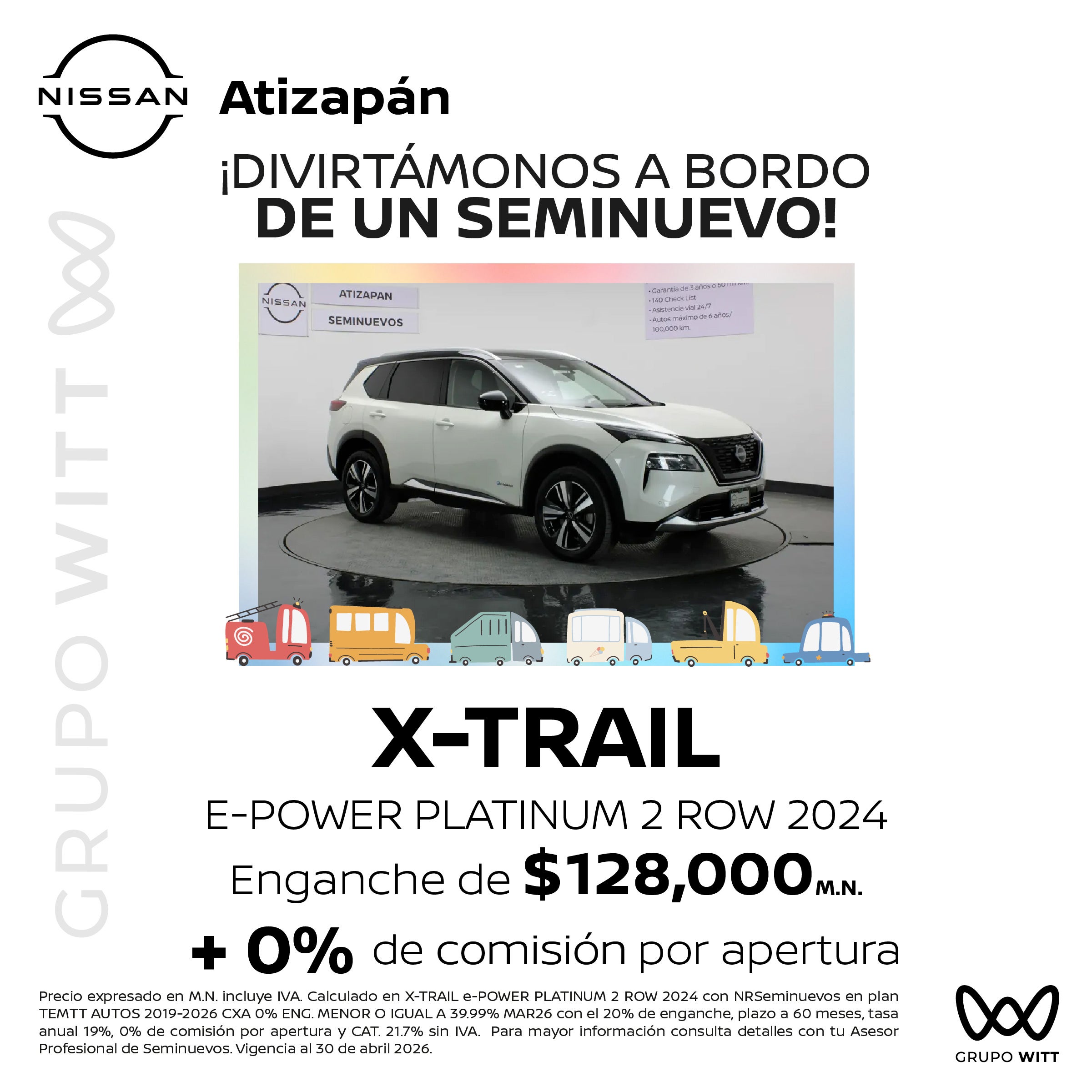 Precio expresado en M.N. incluye IVA. Calculado en X-TRAIL e-POWER PLATINUM 2 ROW 2024 con NRSeminuevos en plan TEMTT AUTOS 2019-2026 CXA 0% ENG. MENOR O IGUAL A 39.99% MAR26 con el 20% de enganche, plazo a 60 meses, tasa anual 19%, 0% de comisión por apertura y CAT. 21.7% sin IVA. Para mayor información consulta detalles con tu Asesor Profesional de Seminuevos. Vigencia al 30 de abril 2026.